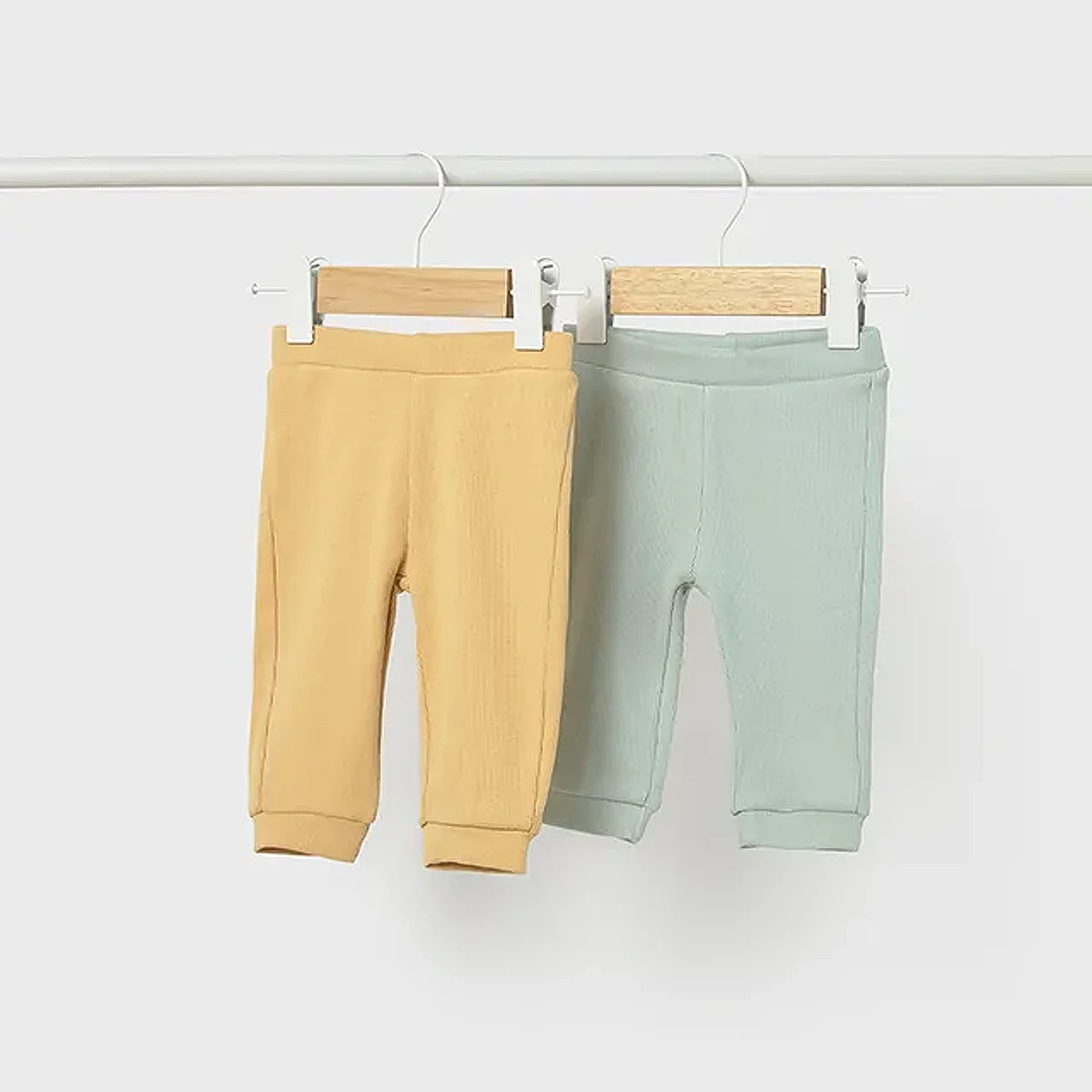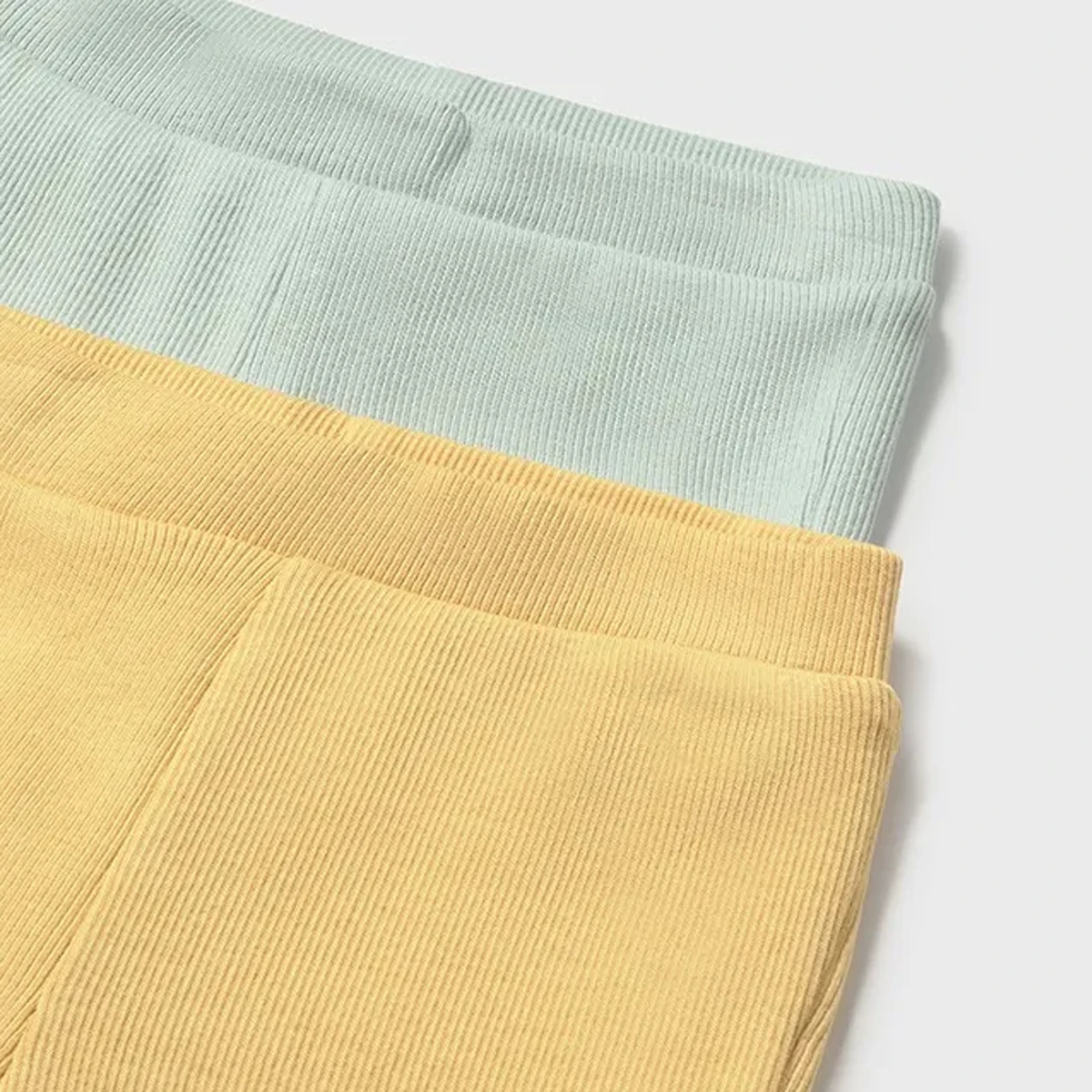 This essential two-piece leggings set offers a practical and stylish foundation for any newborn’s wardrobe, featuring one pair in a soothing mint green and another in a warm honey yellow. Designed with a sophisticated ribbed texture, these long trousers provide a modern aesthetic while ensuring your little one remains comfortable during everyday activities.