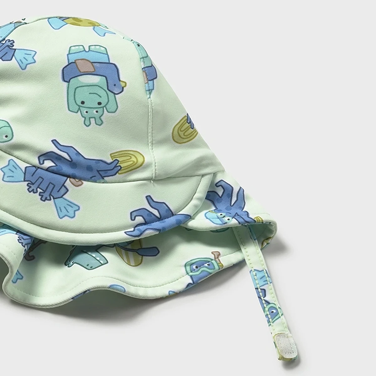 Whimsical Aquatic Print: Features an all-over motif of snorkeling hippos, surfing crocodiles, and turtles in diving gear against a soft mint green background.