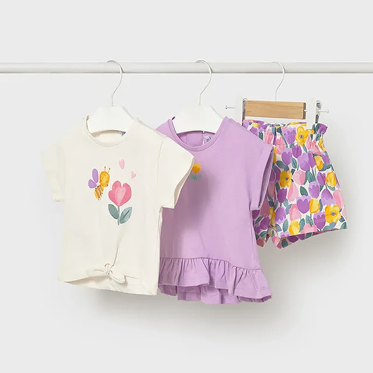 Double the tops, double the fun! This Mayoral three-piece set is the ultimate summer multitasker. Featuring two distinct t-shirts and a pair of vibrant floral shorts, it offers multiple ways to style her look for a day of garden play or a casual family outing.
