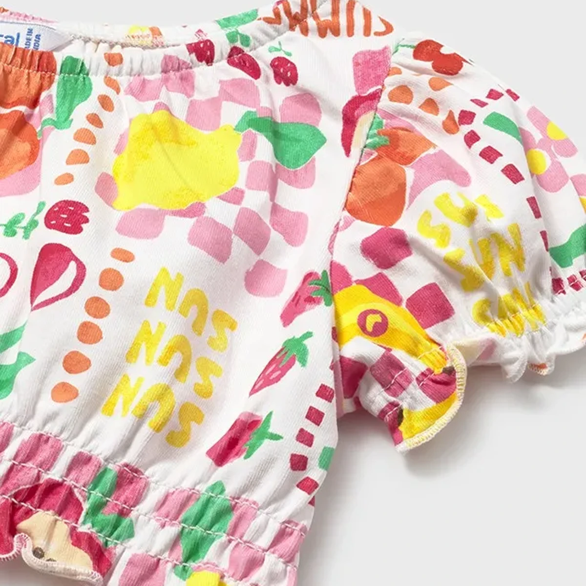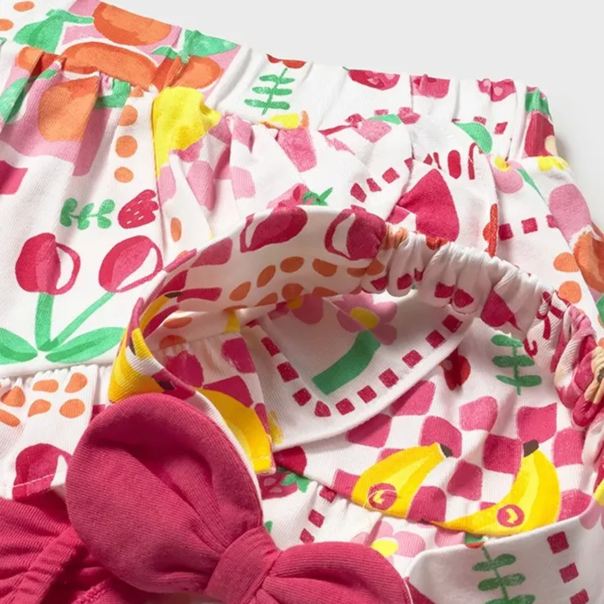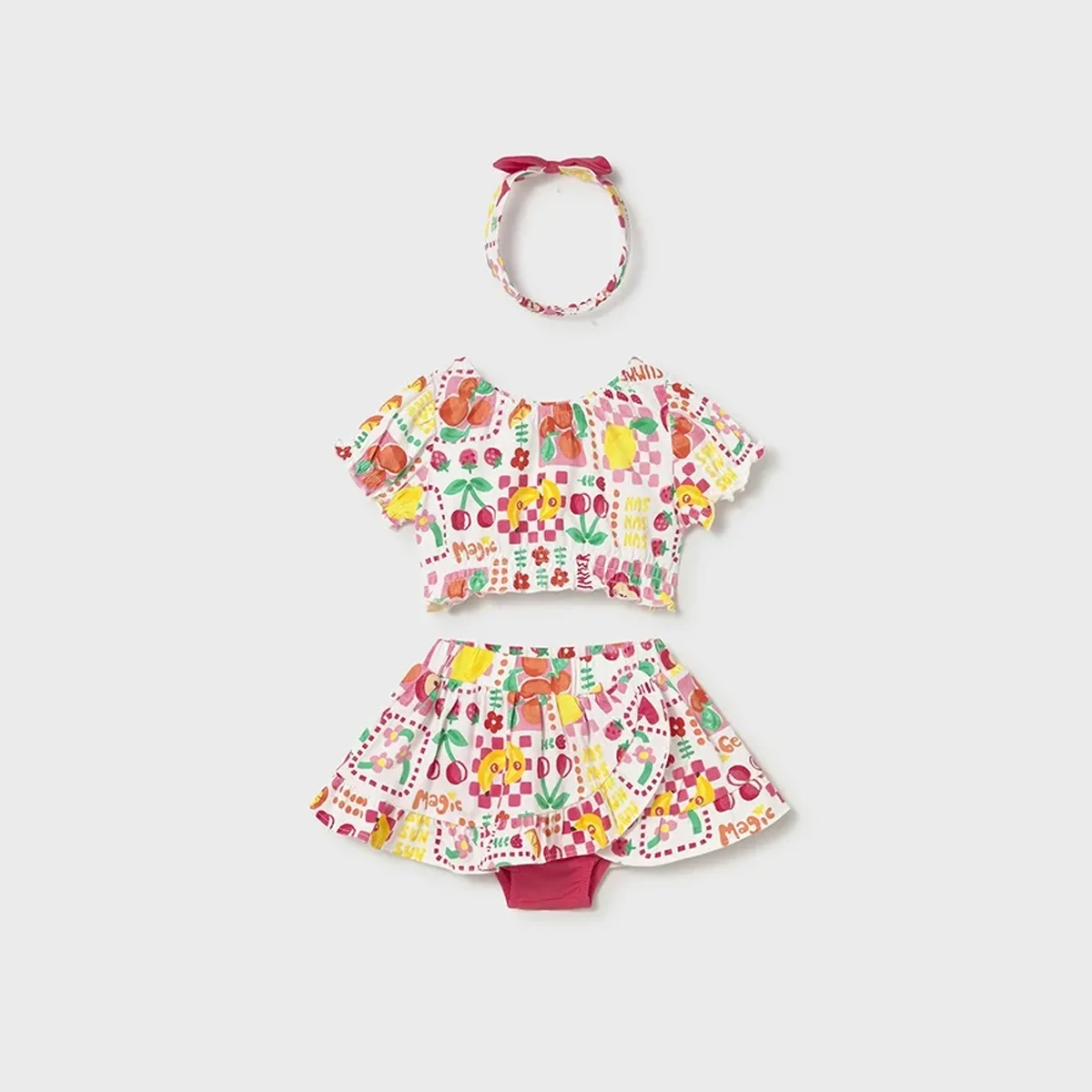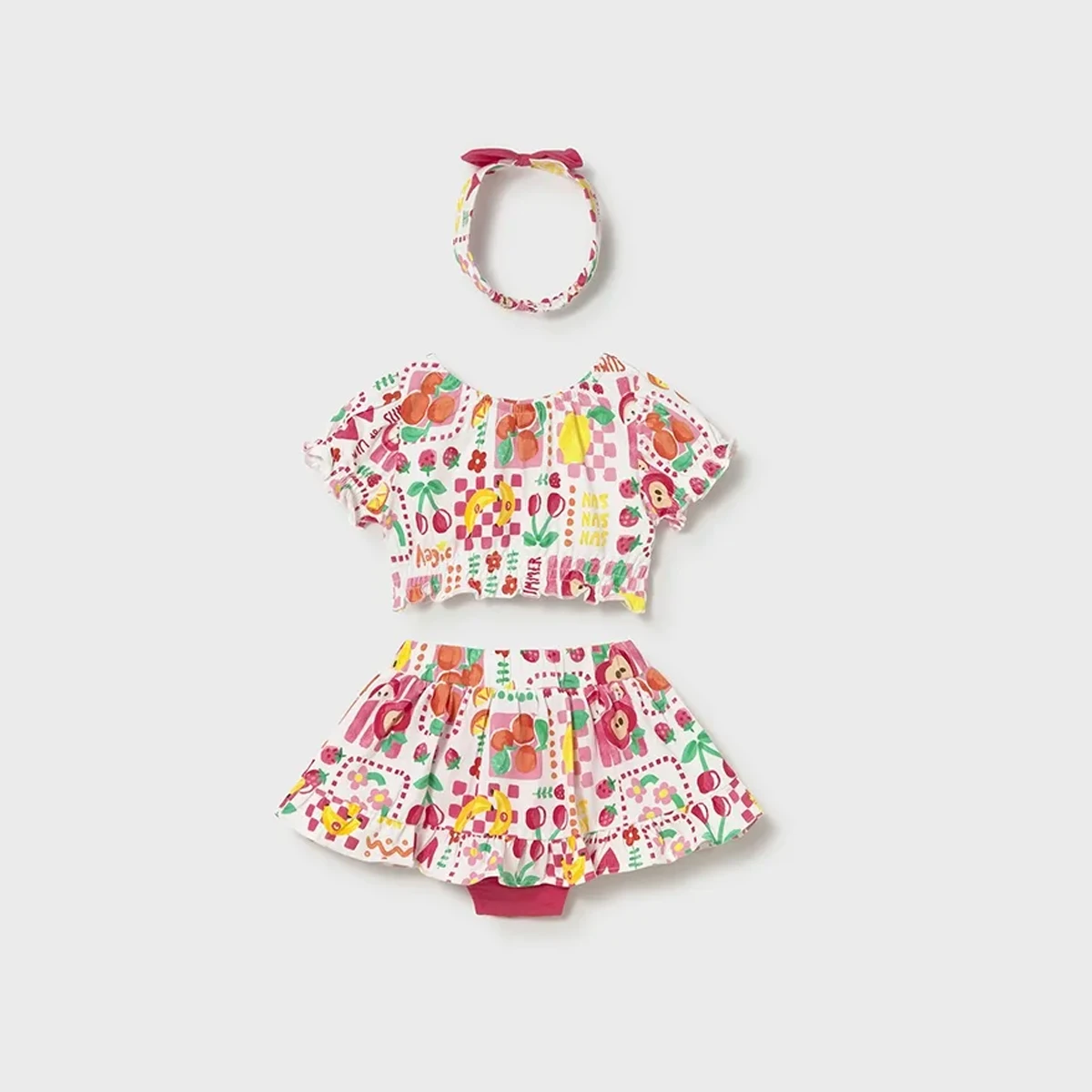 A head-to-toe summer celebration! This vibrant Mayoral three-piece set is the ultimate holiday ensemble, combining a trendy cropped top and a ruffled skirt with a matching bow hairband. Bursting with “fruit salad” energy and a stylish checkered pattern, it’s a high-quality outfit designed for sunshine and smiles.