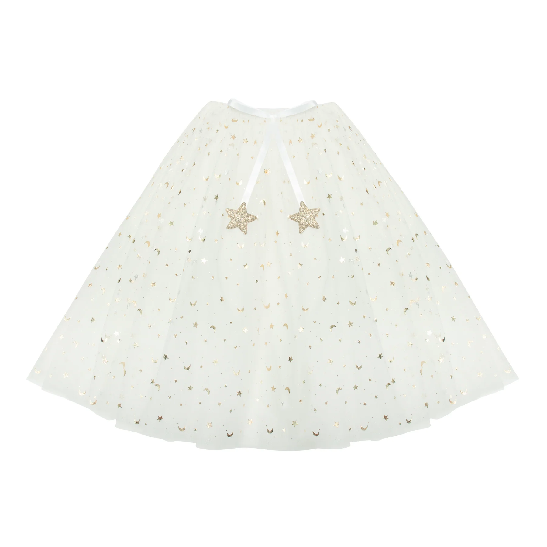 Starry Sparkle: The white tulle is scattered with metallic gold moons and stars for a dreamy, celestial finish.