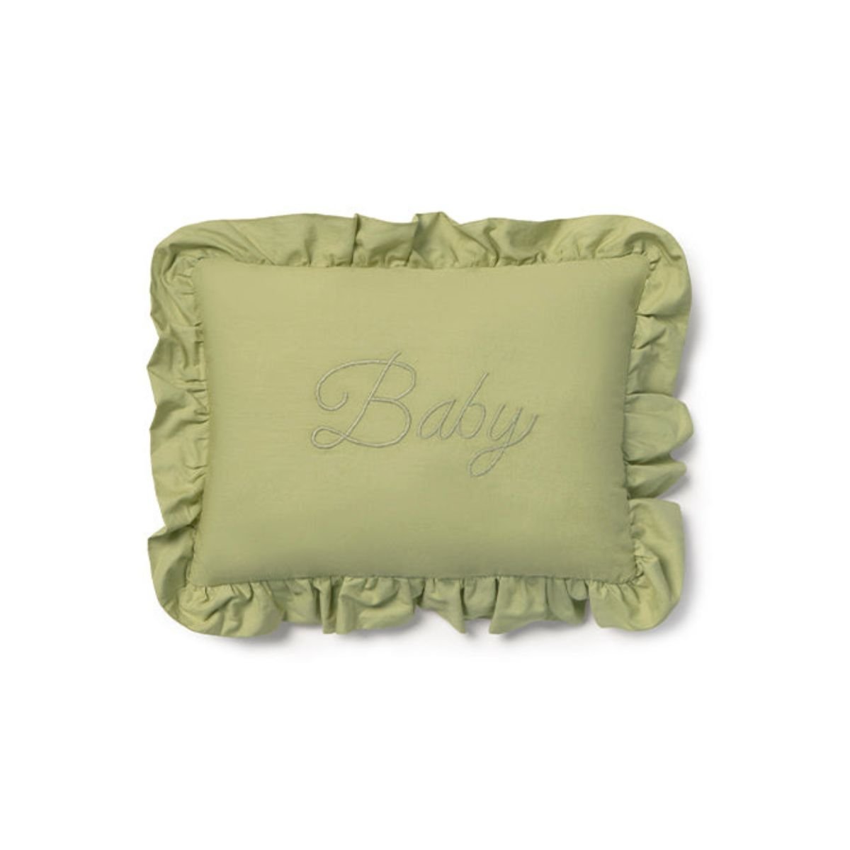The cushion features the word “Baby” delicately embroidered in a classic script across the front. Finished with soft, generous ruffles along the border, it offers a timeless, handcrafted look that adds a gentle and playful accent to your child’s world.