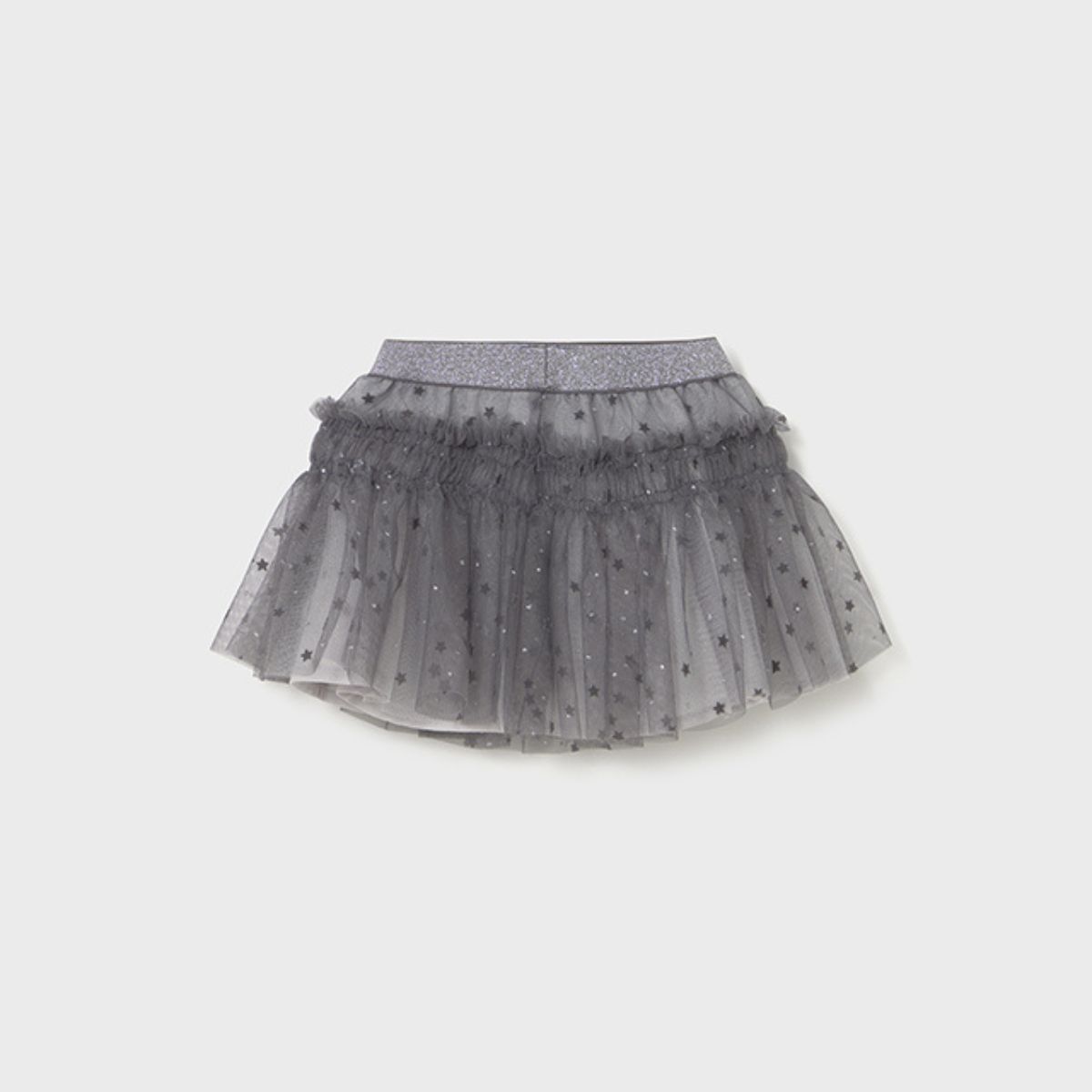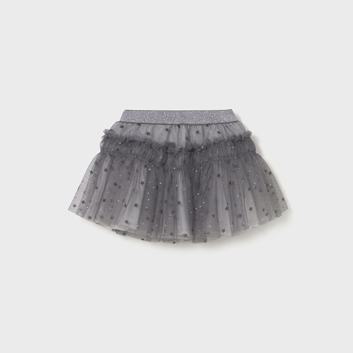 Let your little one sparkle with this enchanting dark grey tulle skirt from Mayoral Baby. Designed with a soft layered mesh and delicate star-shaped details, it brings a magical touch to any outfit — perfect for parties, family occasions, or everyday play.