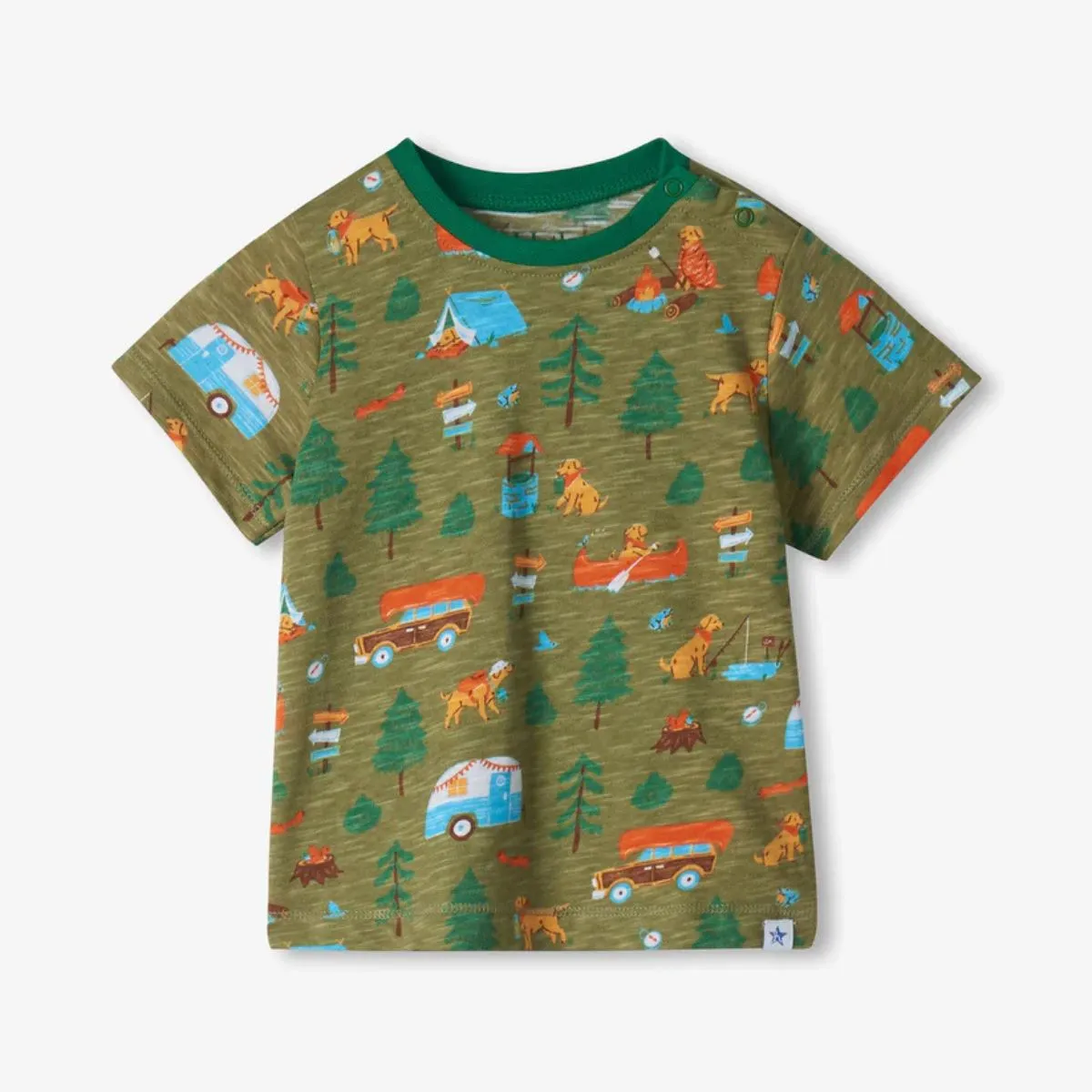 • Tee Style: Short-sleeve crew neck with shoulder snaps and a dark green ribbed trim.