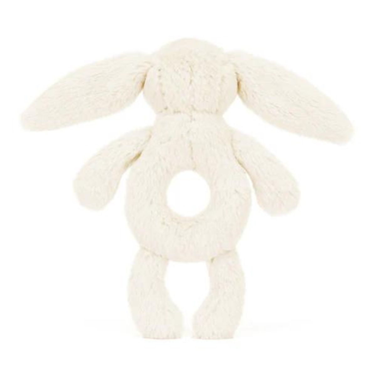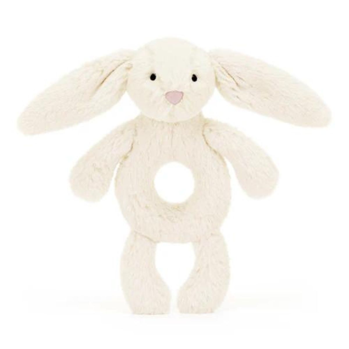 A treat for tiny hands, the Bashful Cream Bunny Ring Rattle is perfect for little ones to grab by its soft paws, long lop ears, or ring-shaped tummy.