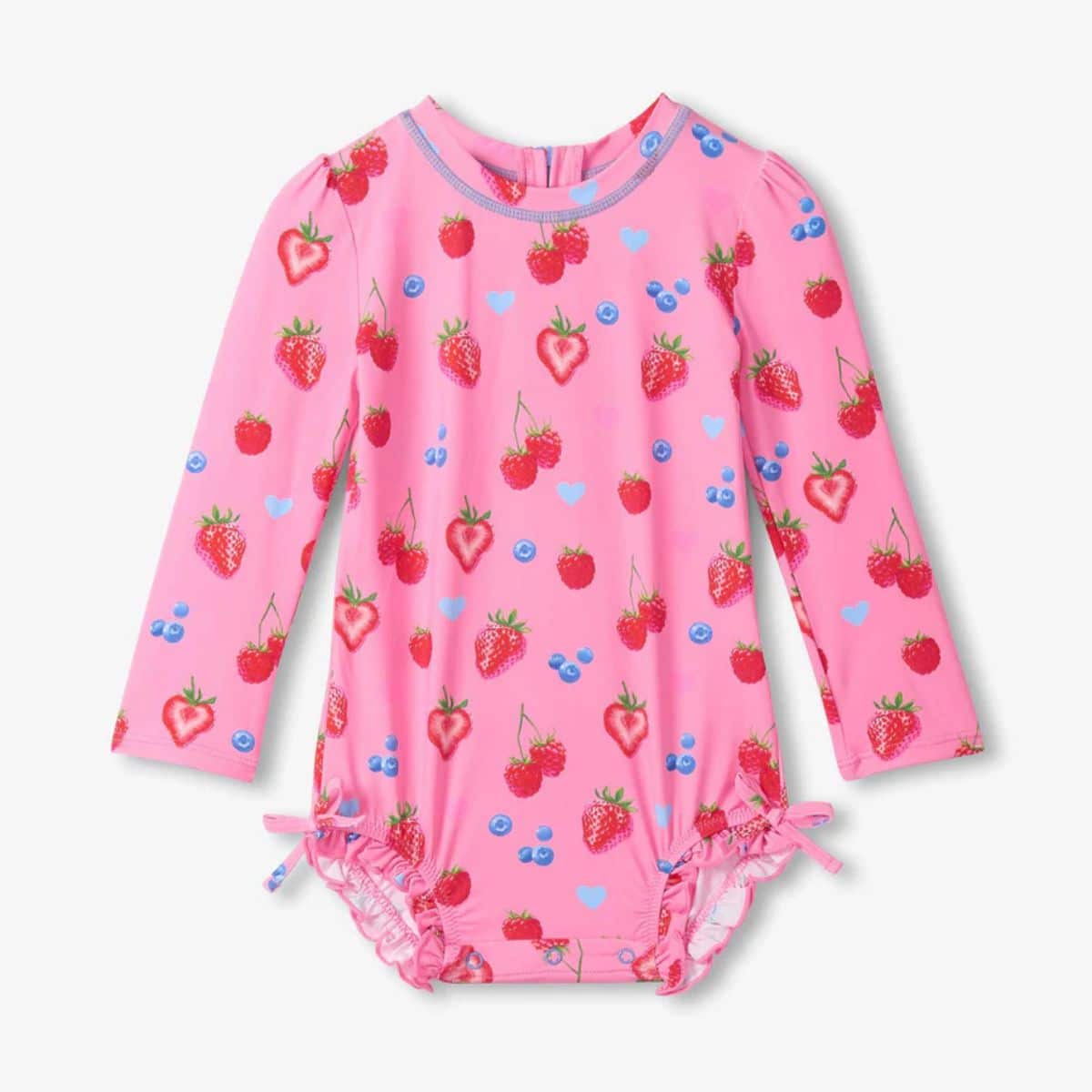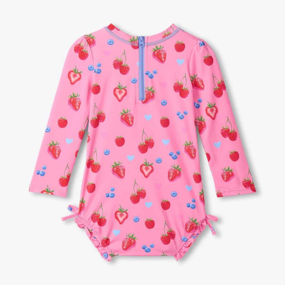 Capture the sweetness of summer with this enchanting Berries One-Piece Rashguard, a playful choice for your little dreamer’s seaside discoveries. Adorned with a delightful harvest of strawberries, raspberries, and blueberries scattered alongside tiny blue hearts, this pink swimsuit turns every splash in the surf into a whimsical garden adventure.