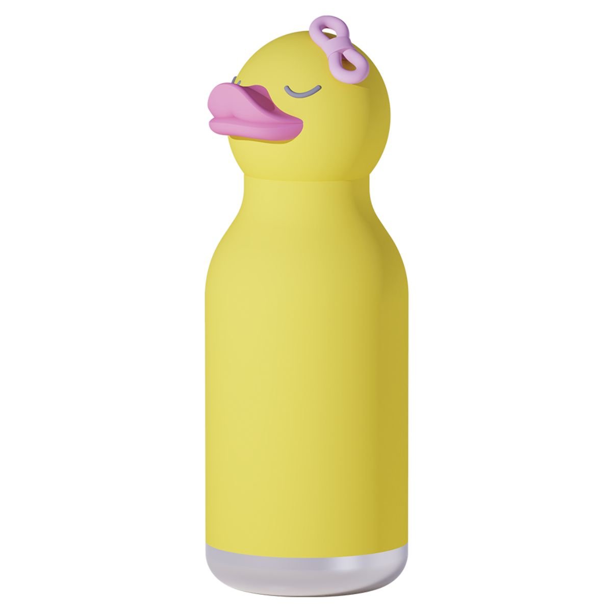 • Charming Character Lid: Features a soft-head yellow duck character integrated into the lid, complete with a dapper pink bow and a matching pink beak.