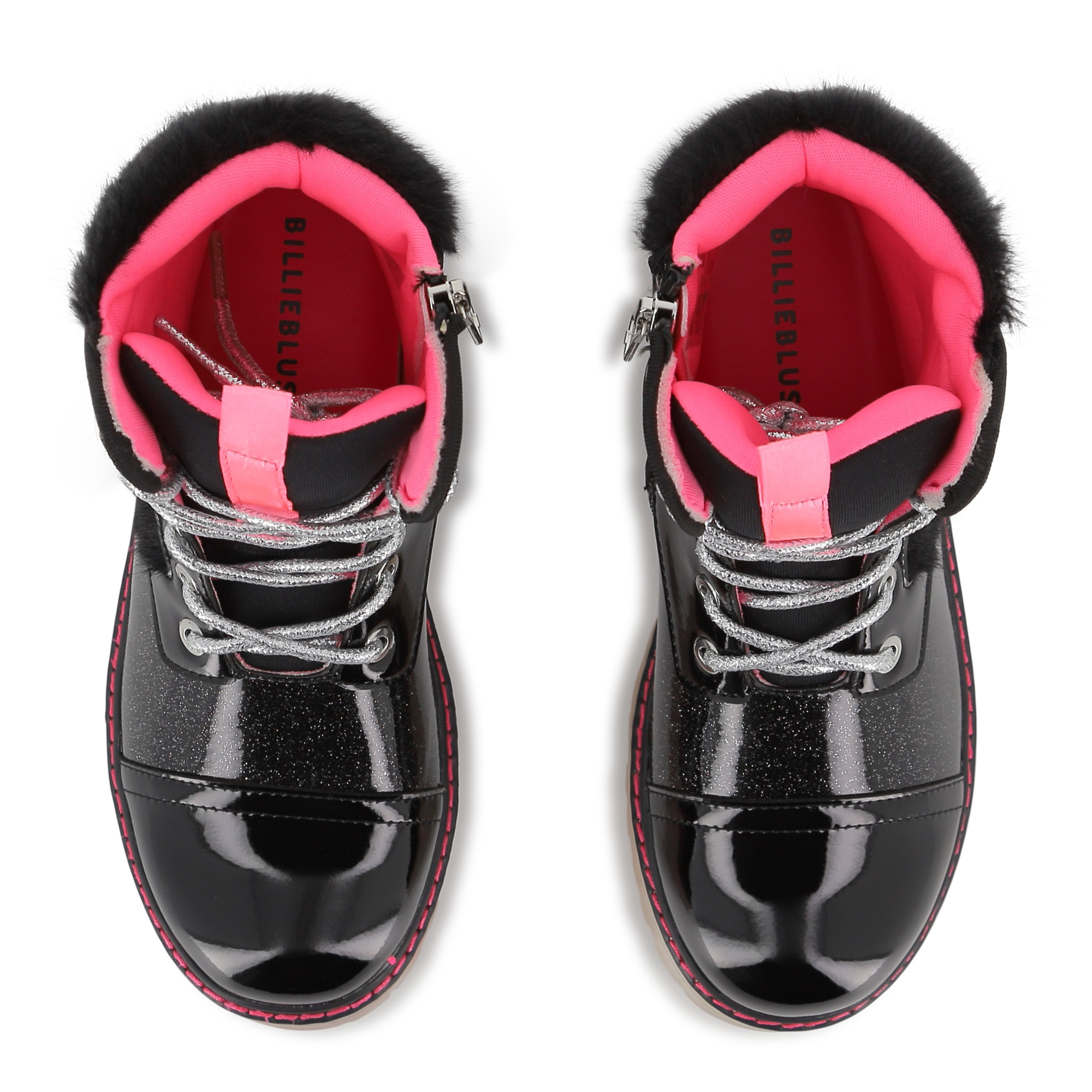 Made from glossy patent-look synthetic material with a touch of glitter, these boots sparkle beautifully with every step. The faux fur collar adds extra warmth and a playful touch, while the silver laces and pink details bring a fun pop of colour.