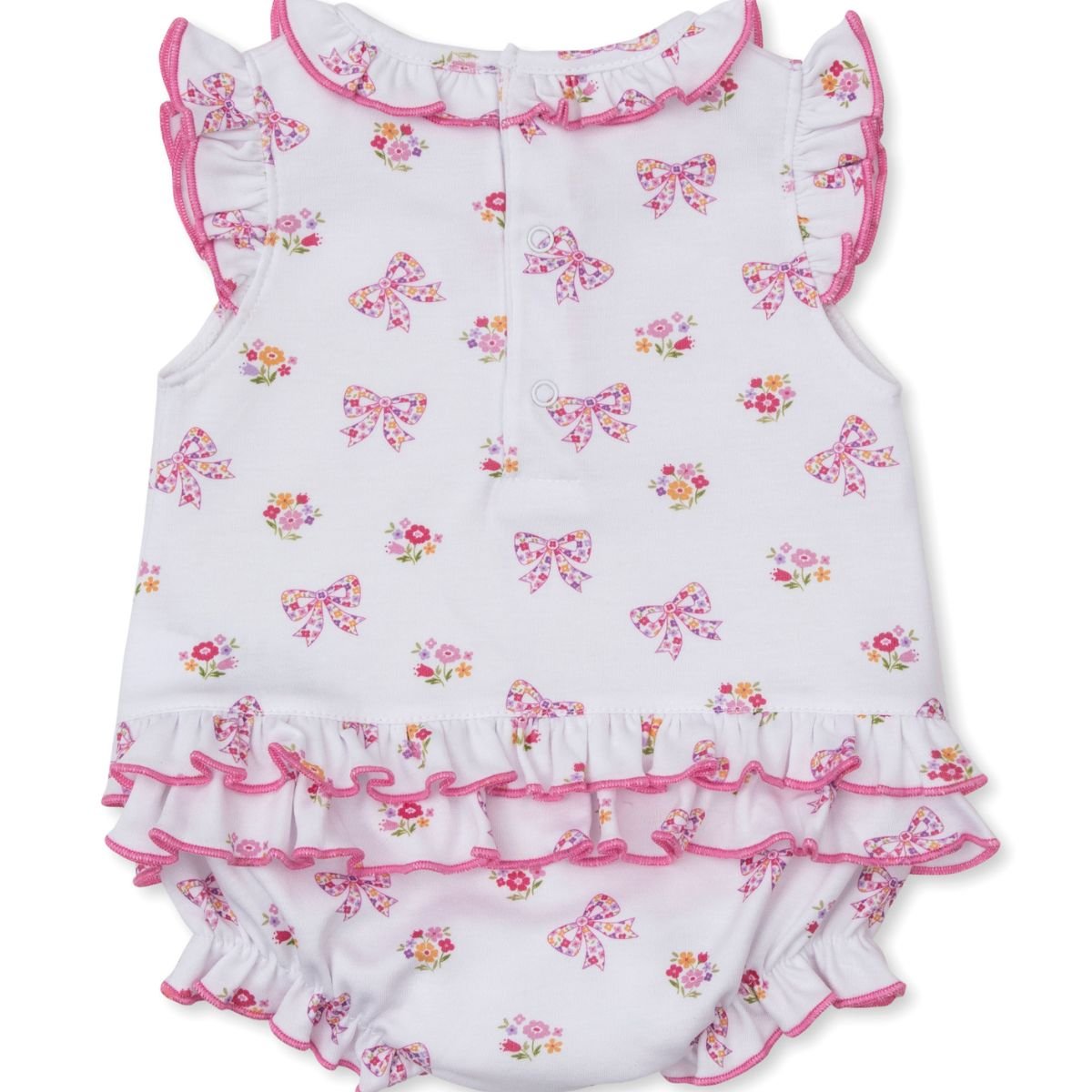 Perfect for sunny spells and playful afternoons, this charming romper brings a touch of storybook magic to her summer wardrobe. Crafted from exceptionally soft Pima cotton jersey, it features an all-over print of pink bows and delicate blossoms in sunny shades of orange and lilac.