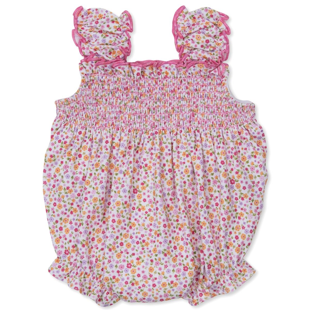Enchanting and timeless, this smocked romper is a perfect choice for your little one’s spring and summer adventures. Adorned with a delicate all-over print of tiny blossoms in shades of pink, orange, and lilac, it brings the magic of a summer meadow to her everyday wardrobe.
