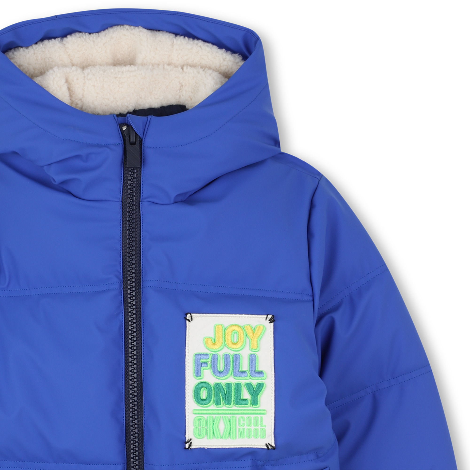 The jacket features two front pockets for practicality and a secure zip fastening for easy dressing. Adding a playful pop of personality, the embroidered chest badge reads “Joy Full Only,” giving the piece a cheerful and distinctive look. Elasticated cuffs and hem provide a snug fit that keeps the cold out while maintaining a relaxed silhouette.