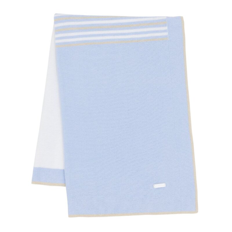 A lovely soft knitted blanket in baby blue and white, perfect to snuggle your little one in.