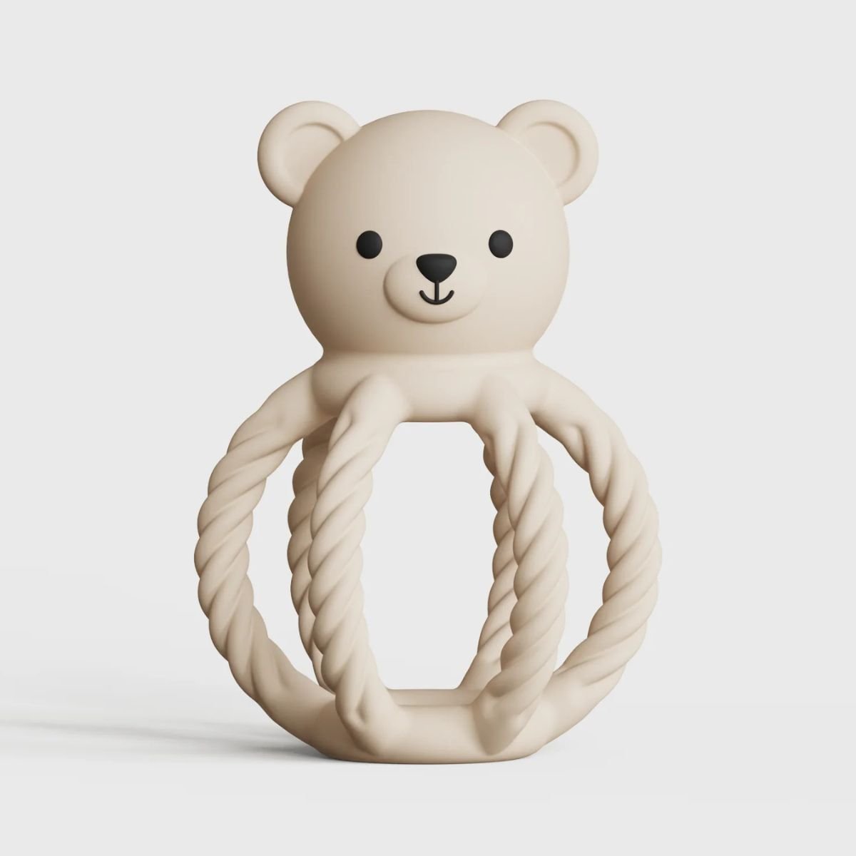 Meet Teddy, a soothing all-in-one companion for your baby’s earliest sensory adventures. This charming 100% food-grade silicone bear combines the calming sound of a gentle rattle with the comforting relief of a teething toy. Designed with a flexible, twist-ring base and textured ears, it is perfectly suited for small hands to grasp and tender gums to explore.