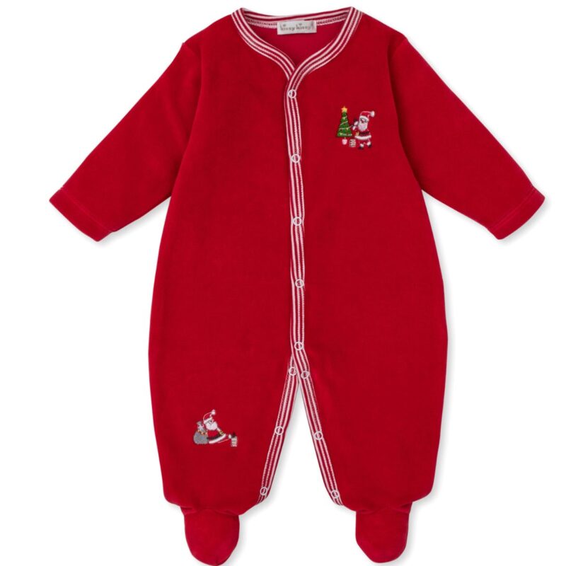 Crafted from ultra-soft velour, this footie is wonderfully soft for the gentlest snuggles. The rich, festive red is beautifully detailed with sweet themed embroidery—like Santa carrying a Christmas tree and another checking his list. The classic striped trim adds a final, charming touch.