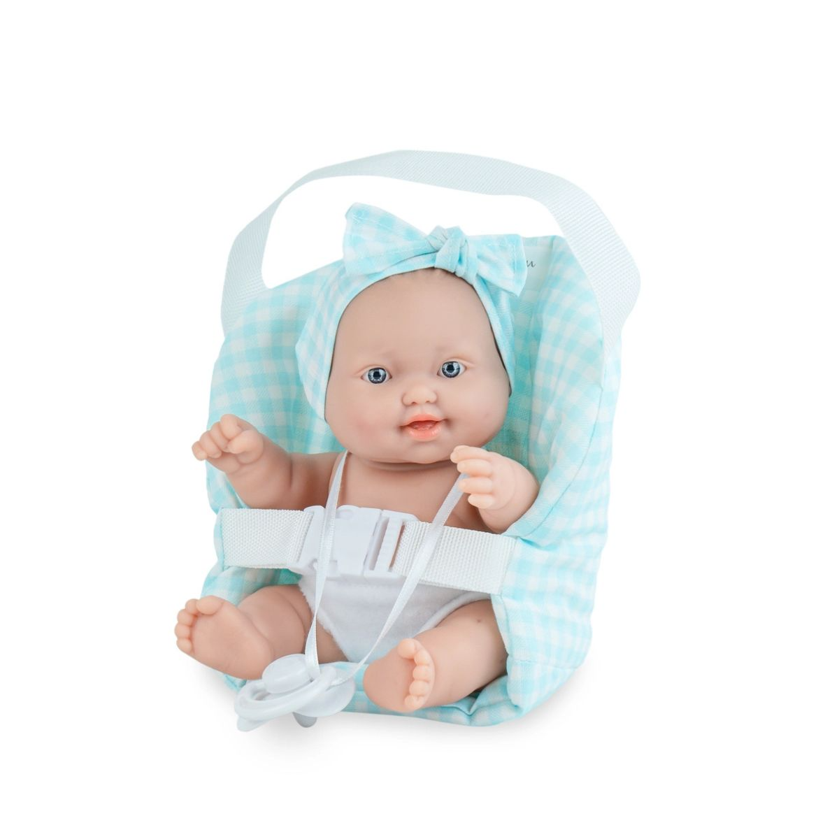 Included Accessories: Comes with a soft blue-and-white gingham baby carrier, a matching knotted headband, and a white pacifier.