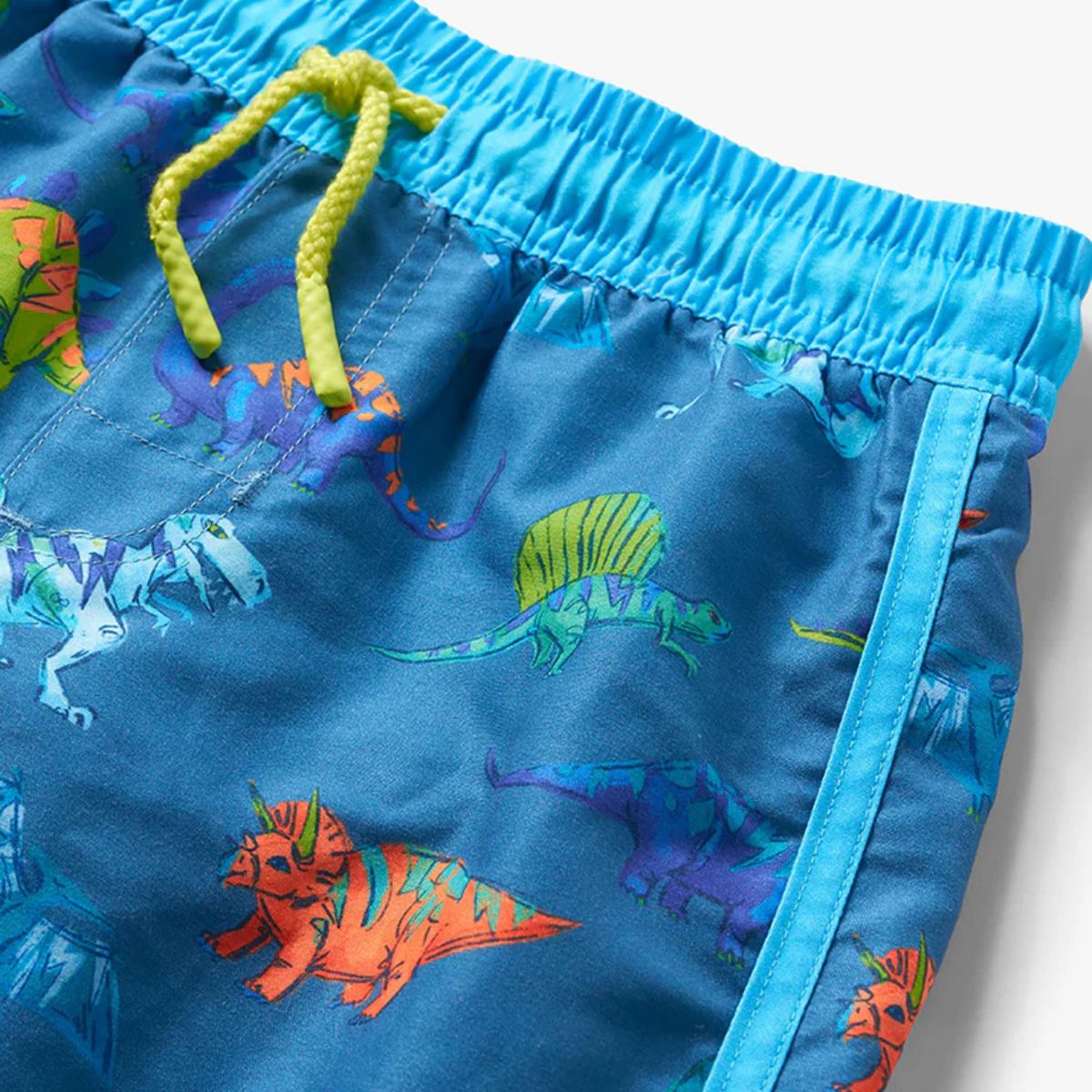 Designed for endless discovery, these trunks feature a contrasting light blue elasticated waistband and a bright yellow functional drawcord for a secure, comfortable fit as he explores his world. The lightweight, fast-drying fabric ensures he stays cosy and happy while transitioning from the ocean to a seaside picnic, while the durable finish keeps his prehistoric pals looking bright through every chlorine or saltwater discovery.