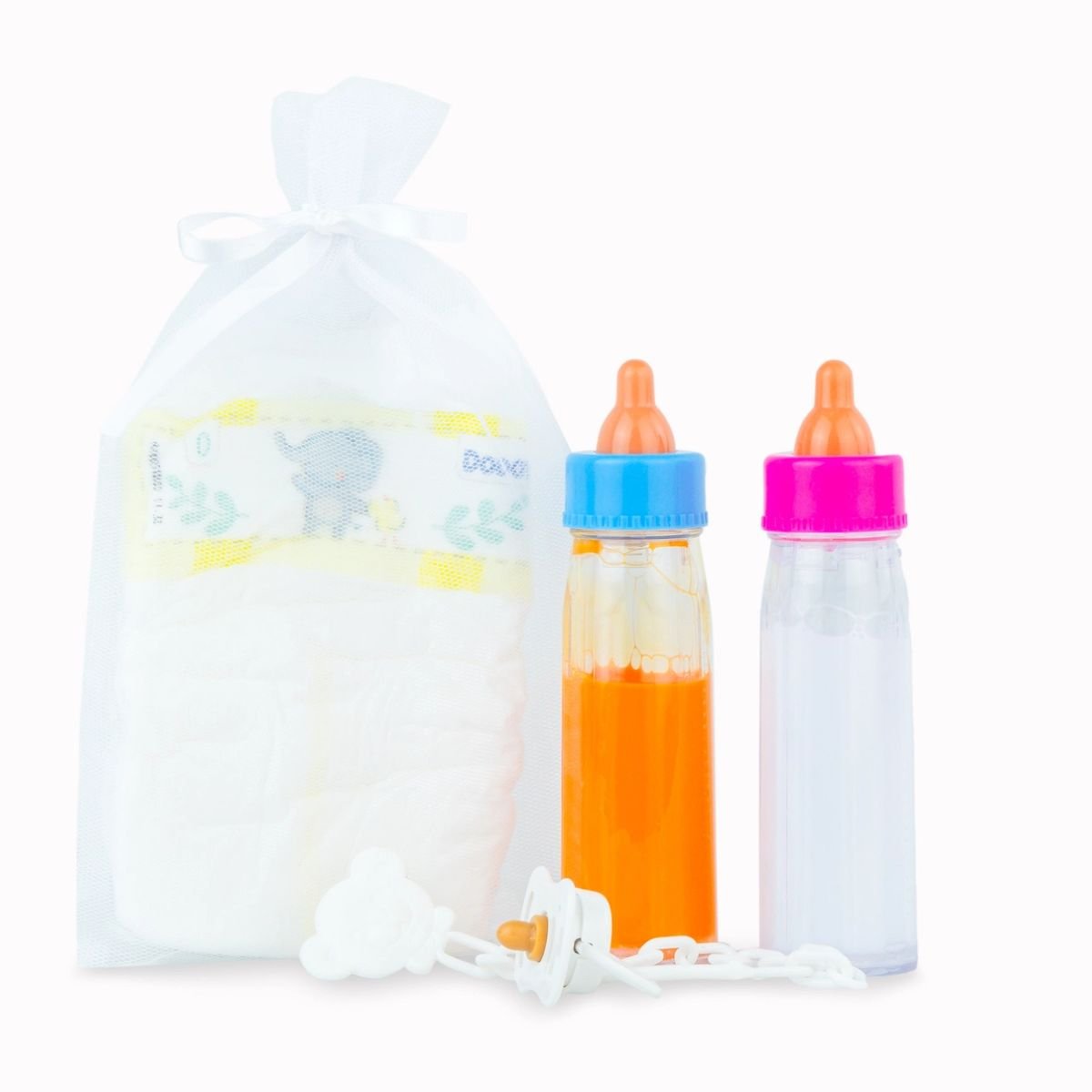 Includes: Diaper, 2 Bottles, Pacifier with Clip, Tulle Bag.