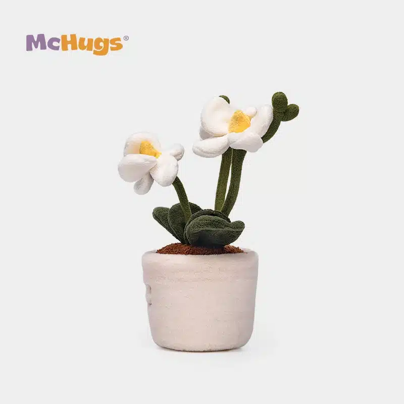 • Potted orchid plush with stitched facial features