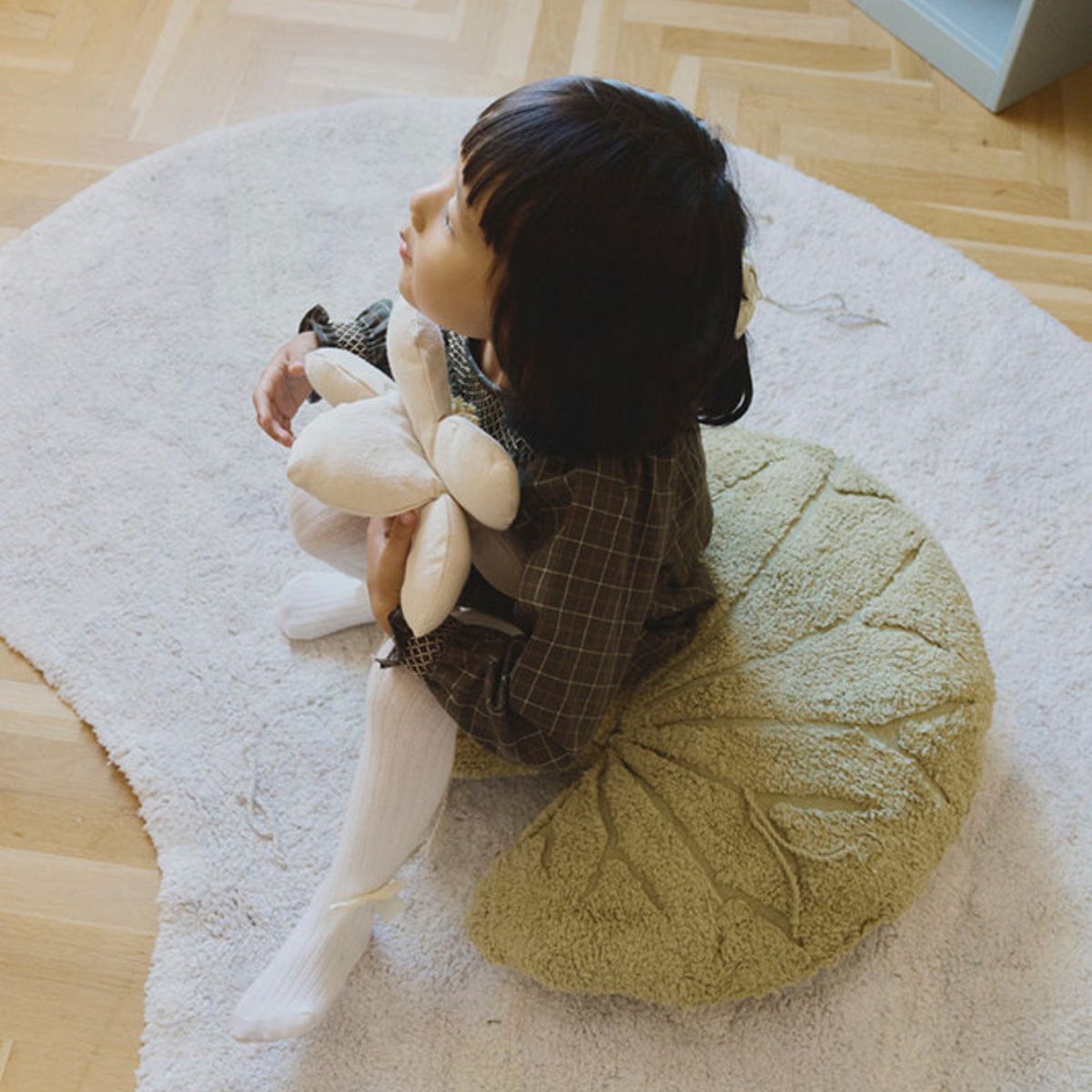 Crafted from durable canvas in soft matcha green, this cushion features an intricate water lily design with visible canvas detailing at the centre. Its unique shape and natural tones bring a sense of calm and whimsical charm to any corner, making it a standout piece that encourages your child to sit, lounge, and dream.