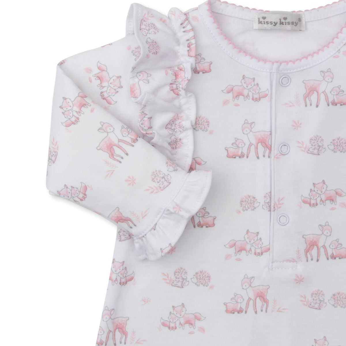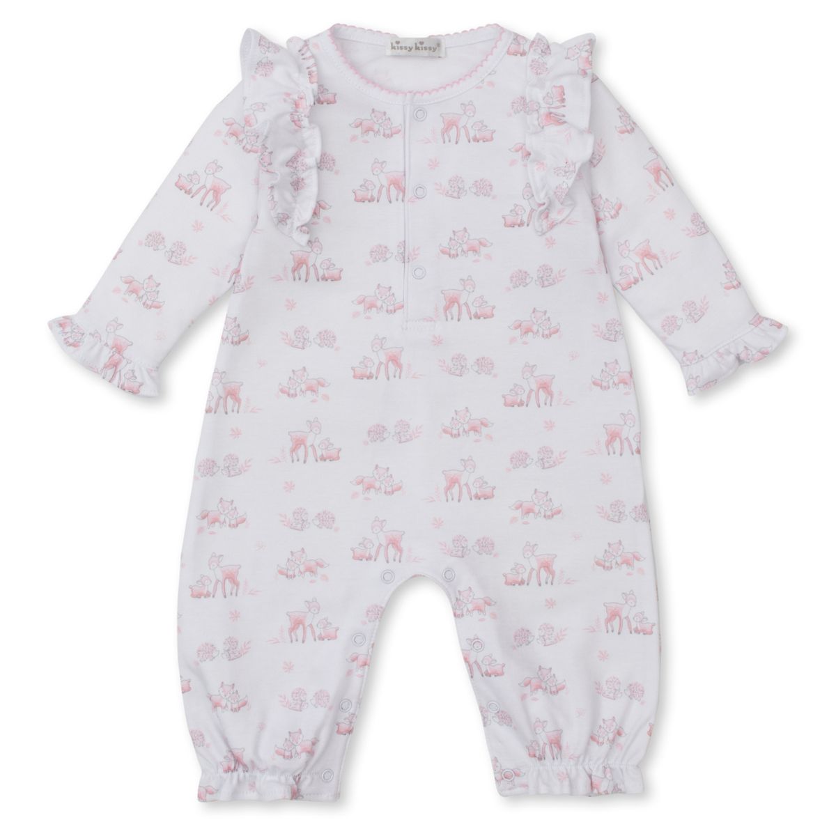 Get your little dreamer ready for a day of play in the enchanted forest! This adorable Forest Fanfare Pink Playsuit is the perfect outfit for magical discoveries. It is covered in a sweet print of woodland friends, featuring cute deer, foxes, and hedgehogs on a soft pink background.