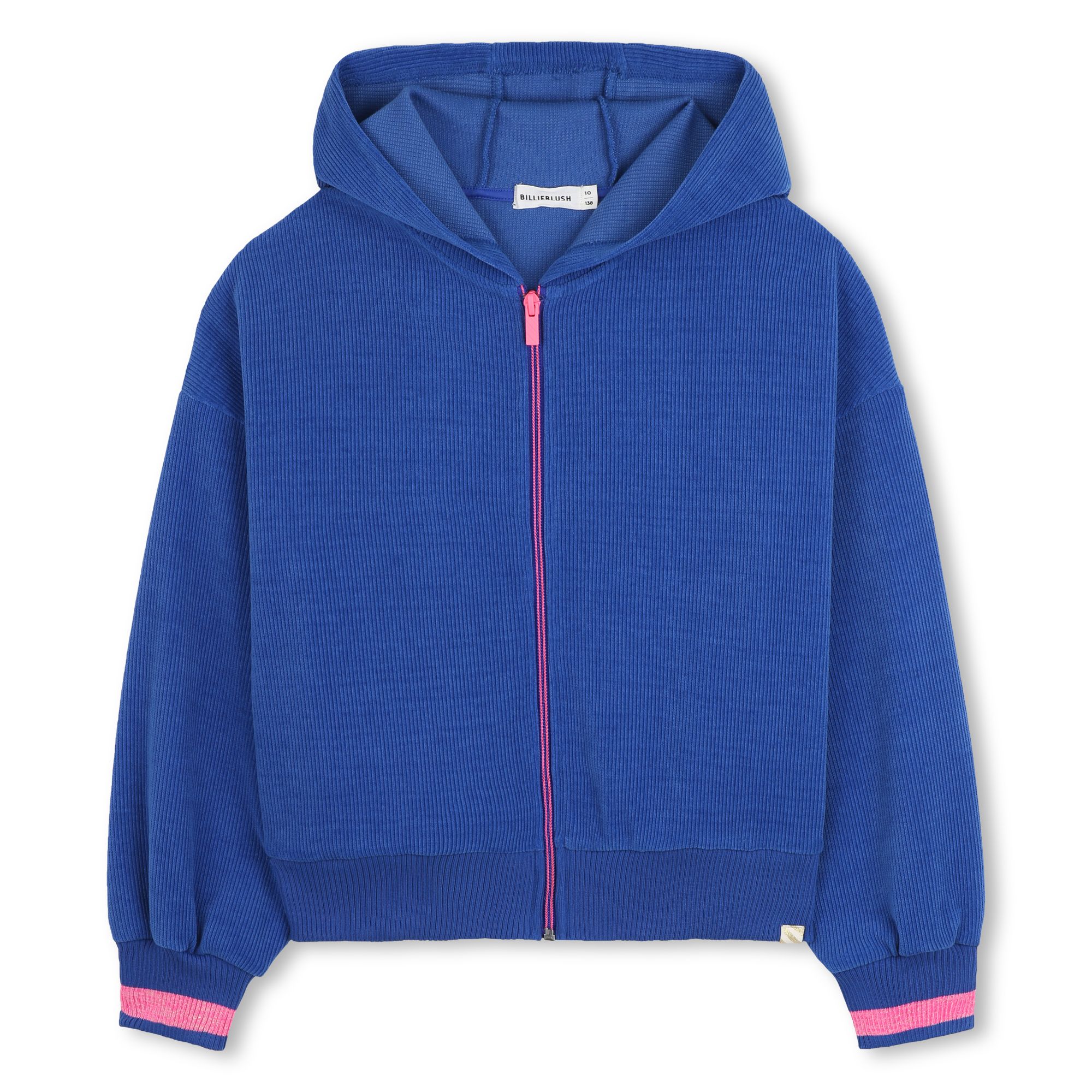 Bring on the cosy vibes with this playful zip-up hoodie by Billieblush. Made from soft, ribbed cobalt blue fabric, it’s perfect for layering on chilly days. The back steals the show with a cheerful “FREE HUGS” slogan in bright pink – a sweet message full of warmth and fun. Finished with striped cuffs and a matching zip, it’s a feel-good favourite she’ll reach for again and again.