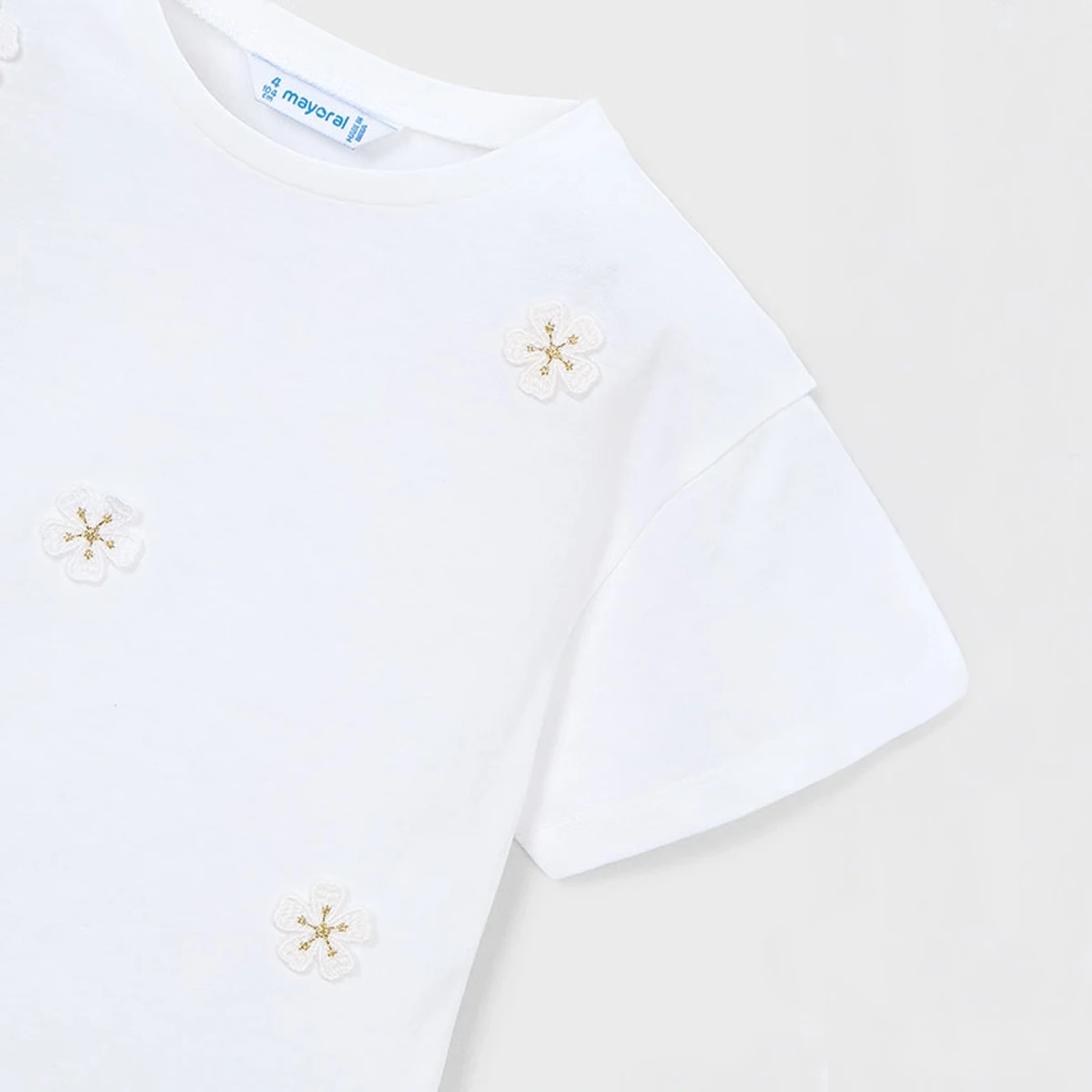 Girls White Cotton Jersey T-Shirt with Appliqué Flowers