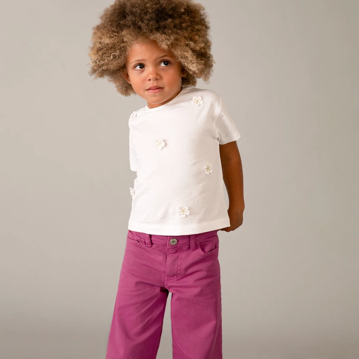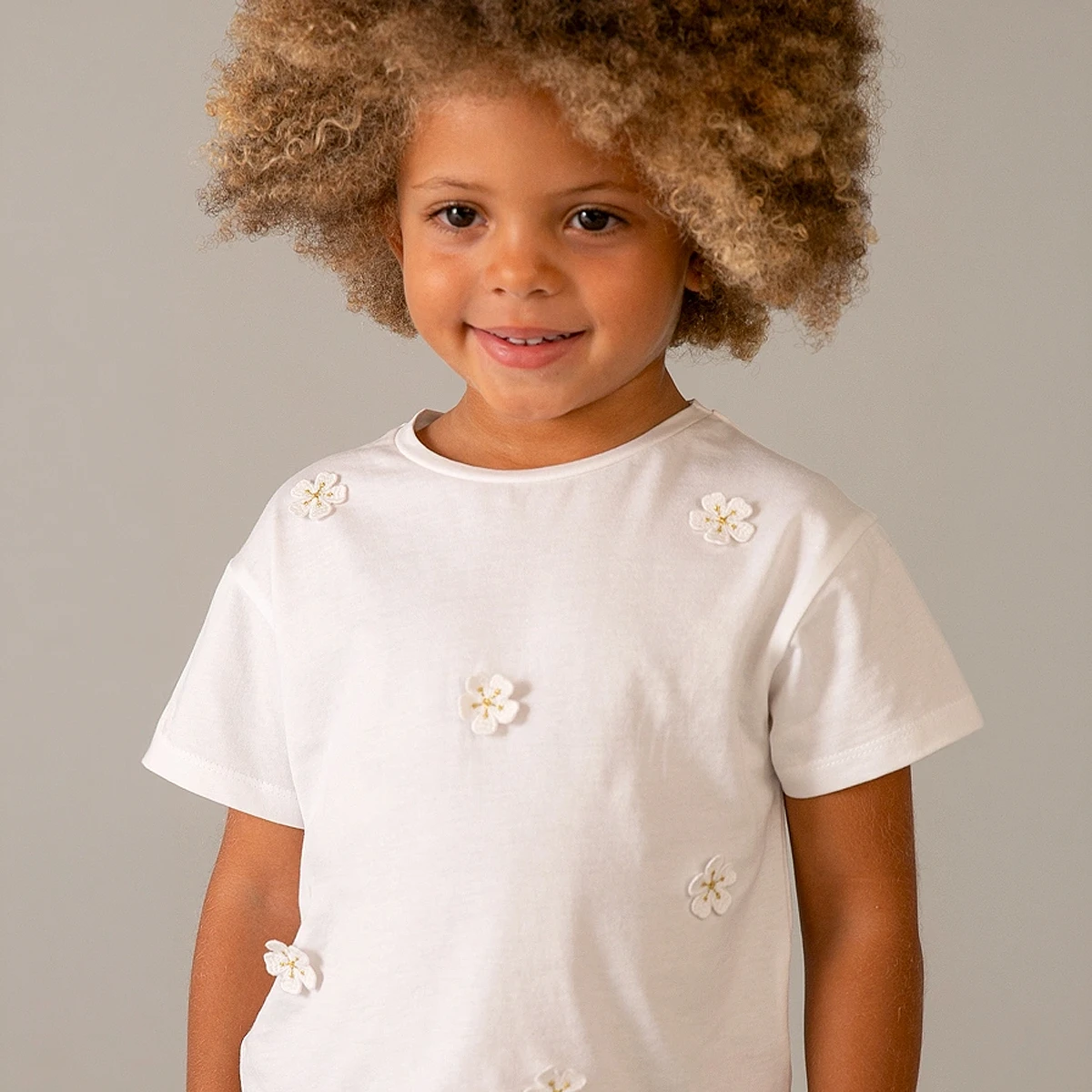 Bring a touch of storybook magic to her everyday adventures with this whimsical white cotton tee. Featuring delicate three-dimensional floral appliqués, it is the perfect blend of comfort and enchanted style for her favourite garden discoveries.