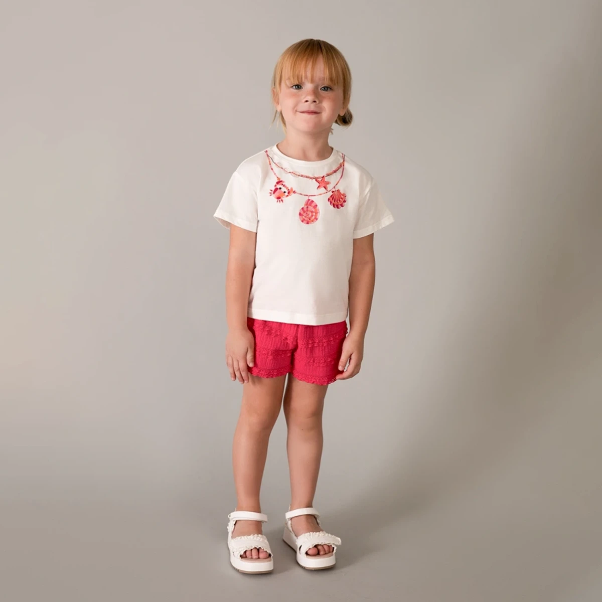 Girls White Necklace T-Shirt & Red Lace-Trimmed Shorts Set