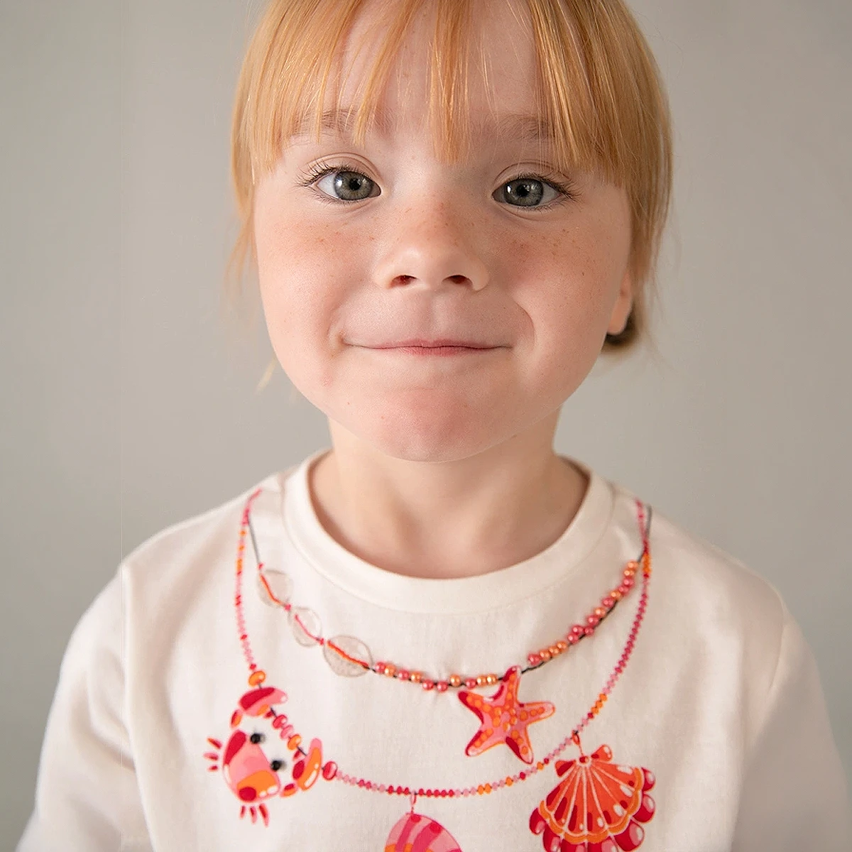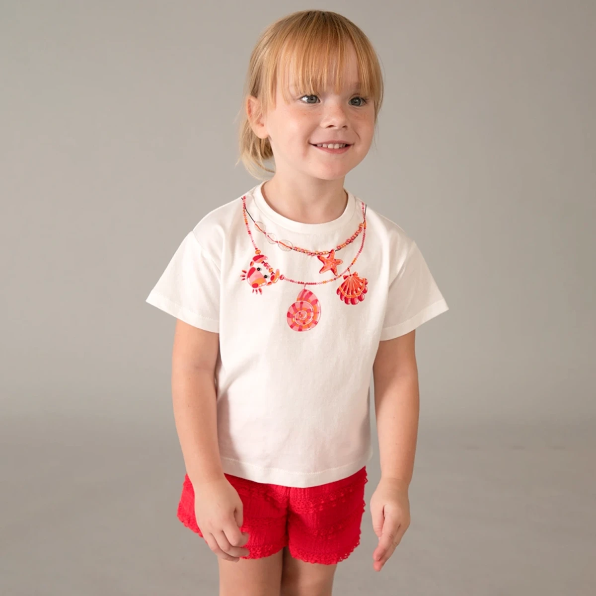 Whimsical “Necklace” Graphic: The crisp white tee features a playful faux-necklace print with colourful “beads” and marine charms—including a smiling crab, a starfish, and shells—so she can look accessorised without the fuss.
