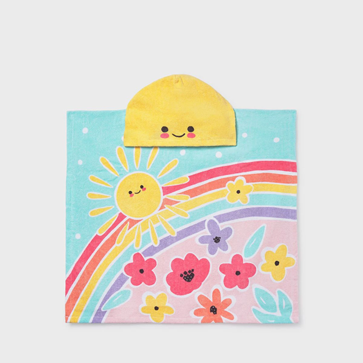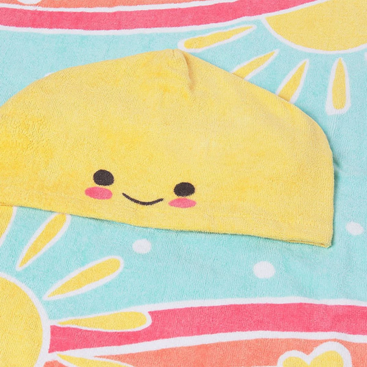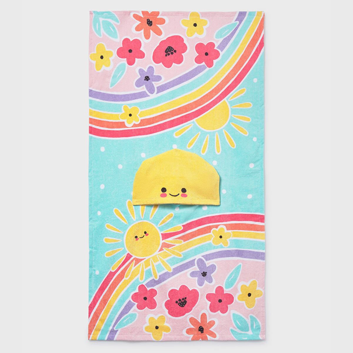 • Hooded beach towel with a vibrant all-over print of suns, rainbows, and flowers.