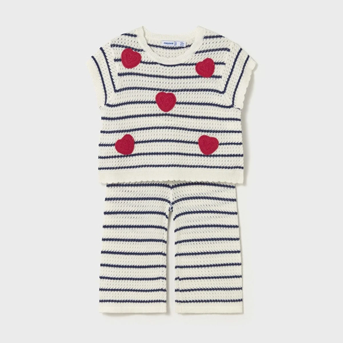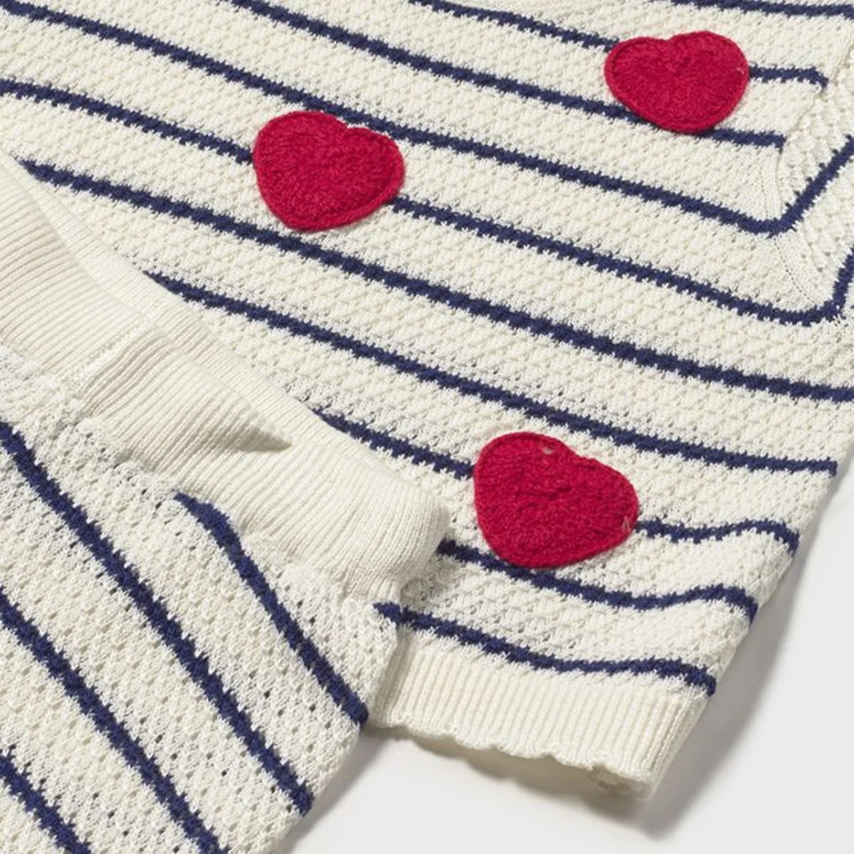 Charming Heart Appliqués: The top is adorned with five vibrant red crochet-style hearts, adding a playful and romantic pop of colour to the navy and white base.