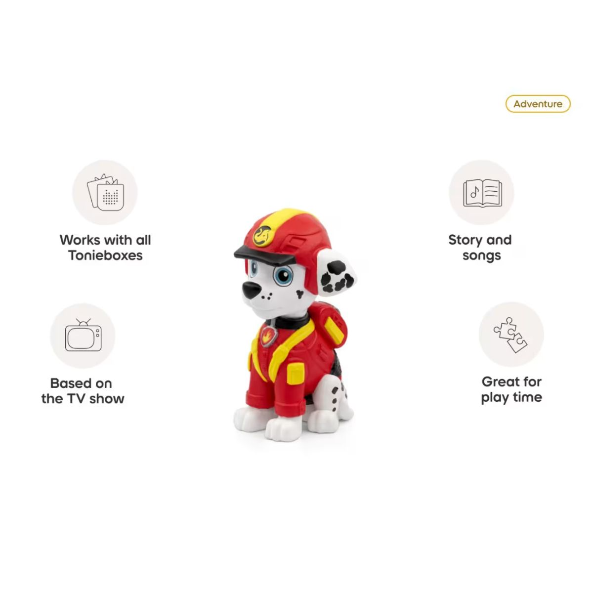 • Organised Fun: The magnetic design ensures Marshall stays securely in place on the Toniebox, keeping your audio collection organised and ready for the next rescue.