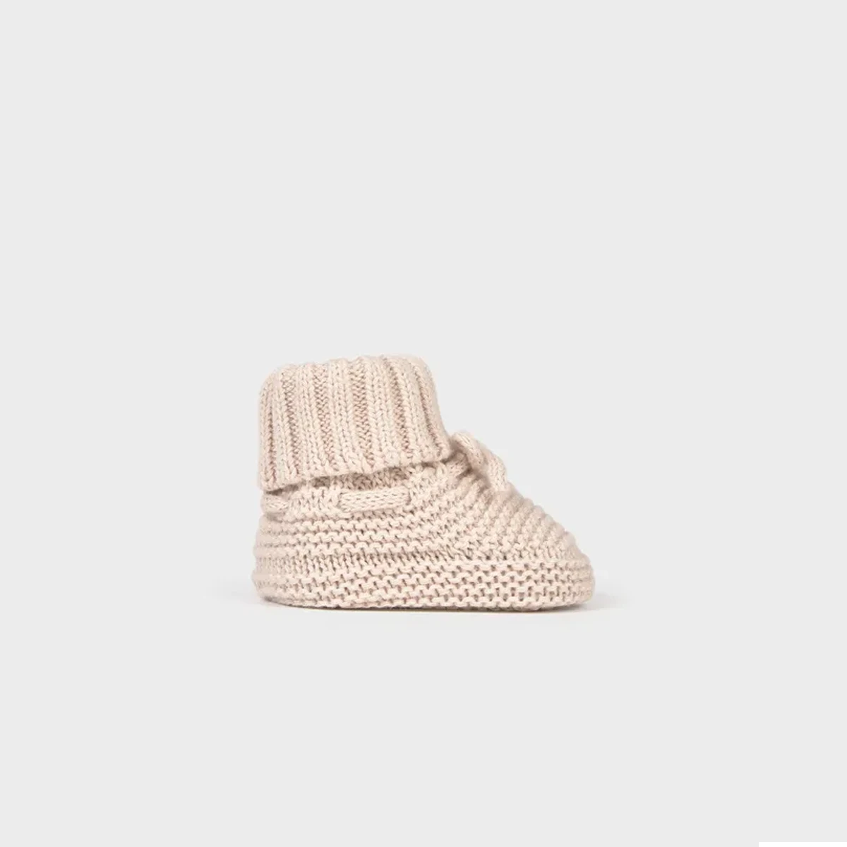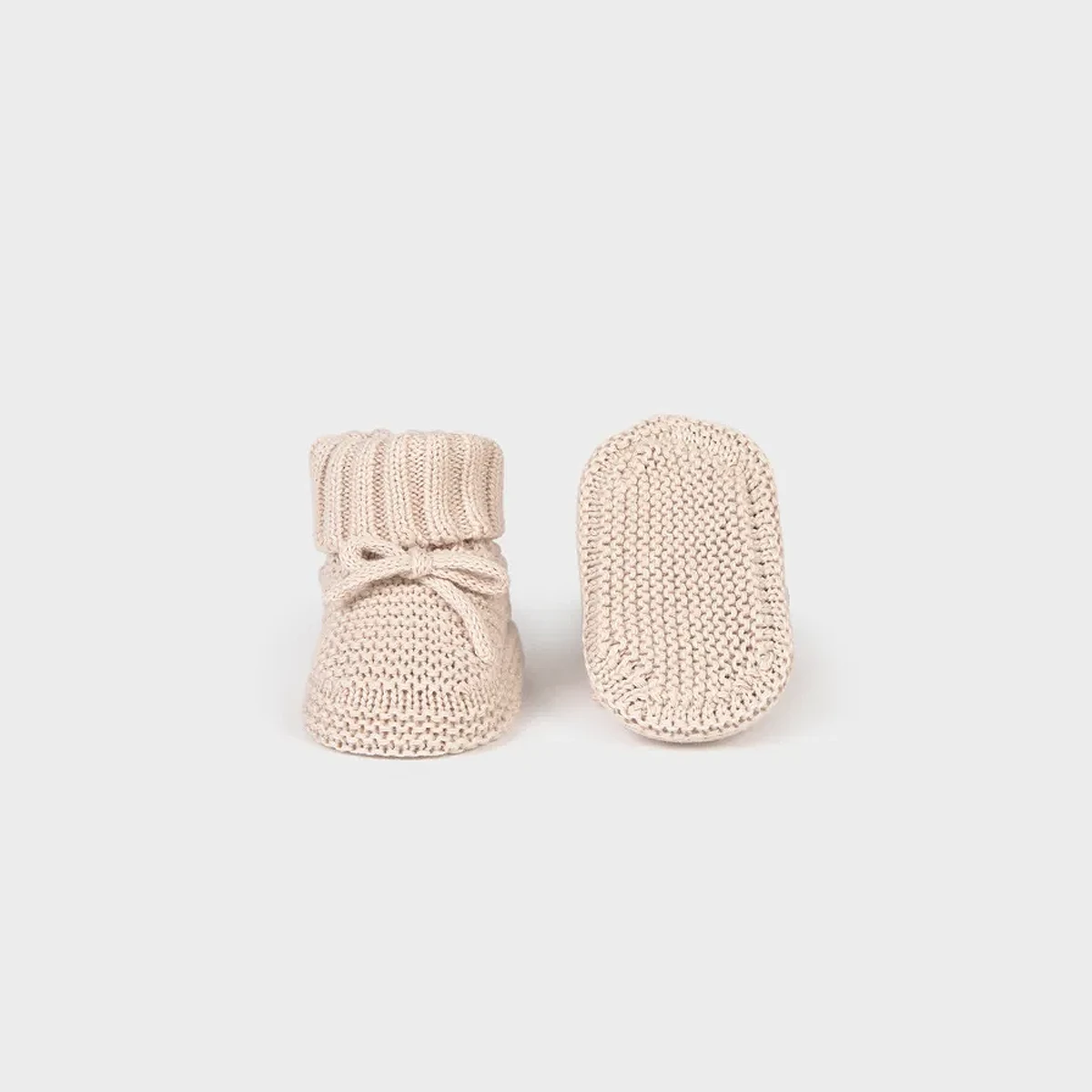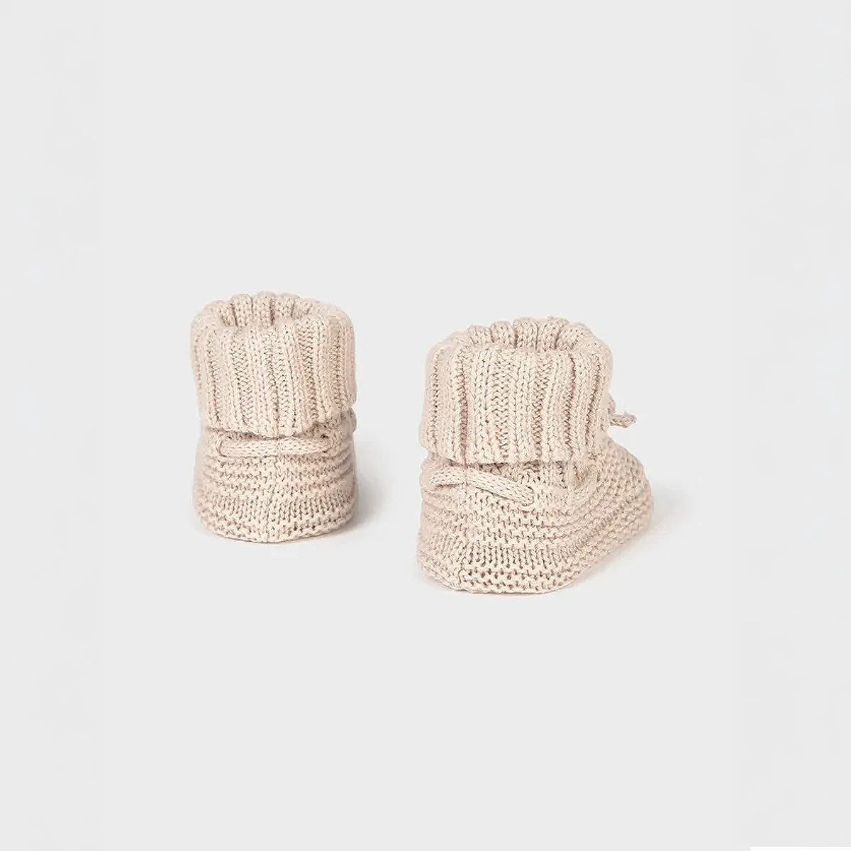 These elegant mole-toned knit booties are crafted from 100% cotton, providing a soft and breathable layer for a newborn’s delicate feet. The design features a classic textured knit with a ribbed turnover cuff, ensuring a secure and comfortable fit that stays in place. Detailed with a charming matching knit bow, these booties offer a refined, artisanal look that coordinates perfectly with our neutral seasonal collections.