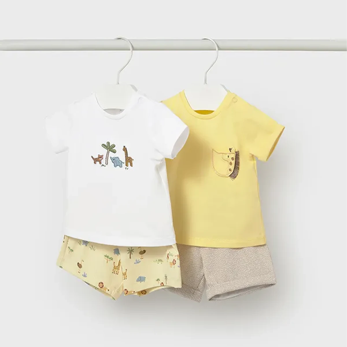 This coordinated four-piece safari-themed set is designed for effortless summer styling, offering a variety of mix-and-match combinations for your little explorer. Featuring two soft-touch t-shirts and matching shorts in a sunny yellow, crisp white, and neutral beige palette, this ensemble blends playful graphics with high-quality comfort. Crafted from a premium cotton-rich blend, it ensures a breathable and flexible fit for all-day play.