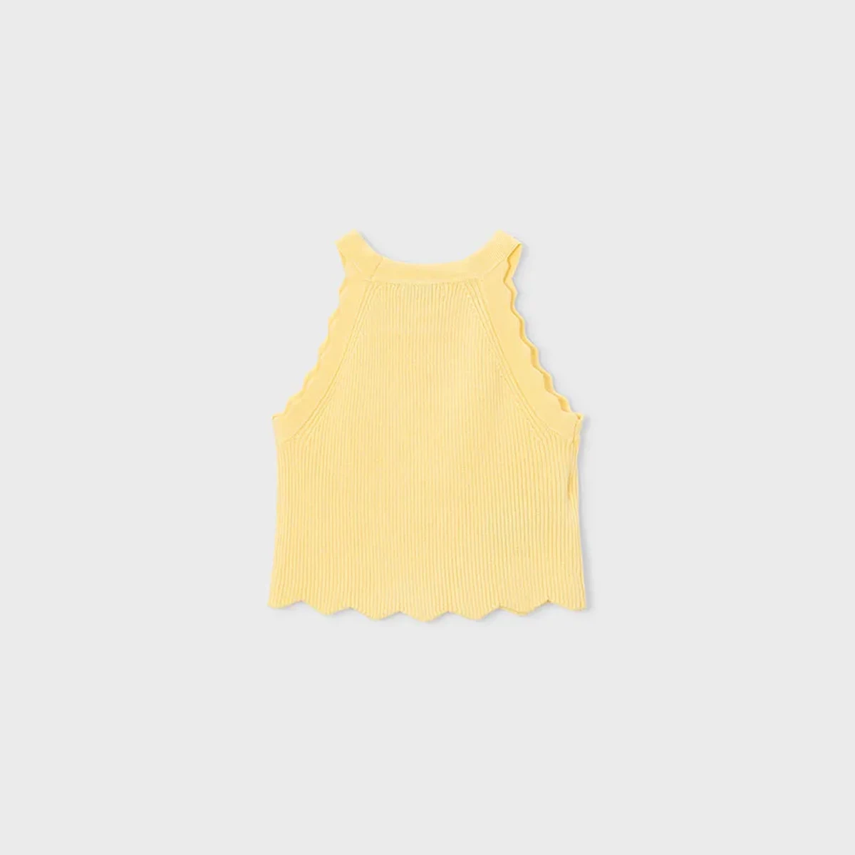 This elegant vanilla knit top features a sophisticated halter-style silhouette and a beautifully soft ribbed texture. Designed with delicate scalloped edging along the armholes and hem, it offers a refined look perfect for warm-weather garden lunches or special family occasions. The fine-gauge knit provides a comfortable, breathable fit, ensuring your little one stays cosy while maintaining a polished summer style.