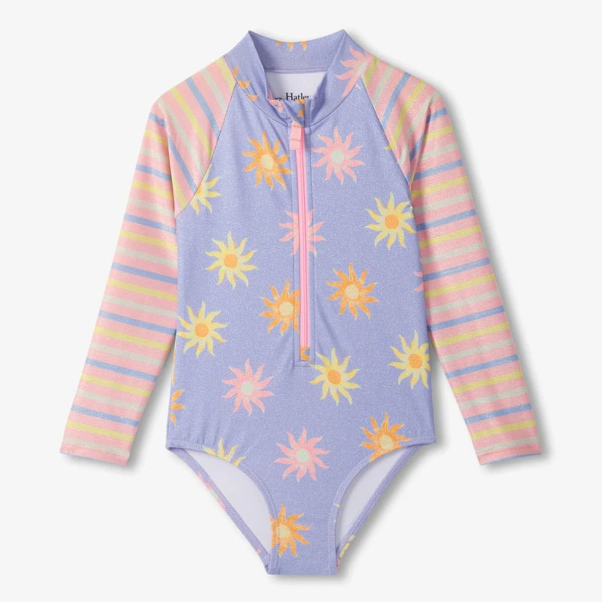 Catch the sun and let her imagination soar with this shimmering Lavender Sunshine Swimsuit, a piece designed for every little dreamer who finds magic in a seaside afternoon. Crafted from a glittery lavender fabric that catches the light with every splash, this one-piece features an enchanting all-over sunshine pattern in cheerful yellow and orange. Whether she is exploring hidden tide pools or dancing through the garden sprinklers, the playful pink raglan sleeves—adorned with soft grey, yellow, and blue stripes—ensure she stays cosy and covered throughout her storybook adventures.