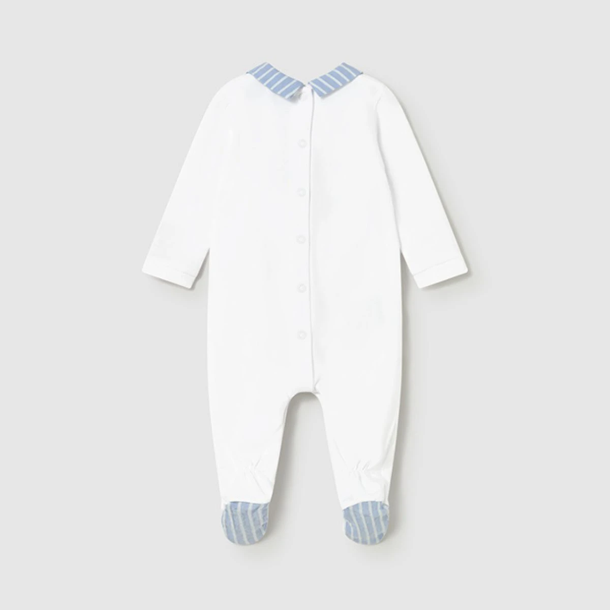 Nautical Coordination: The light blue and white striped collar and footie details perfectly mirror the pattern of the Print Romper Newborn With Hat, allowing for seamless coordination within the collection.