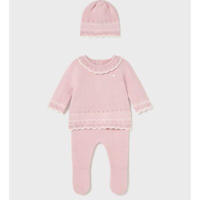Dusky pink and ivory sustainable cotton dungaree set for baby girls by Mayoral Newborn. Soft and lightweight, the dungarees and hat are patterned with little gold foil hearts. The dungarees have adjustable shoulder straps, side pockets and frilled cuffs, and the ivory and gold stripe ribbed T-shirt has pretty ruffled sleeves.