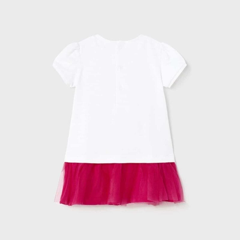 Cute white and pink dress for little girls, by Spanish brand Mayoral. Made in soft cotton jersey, this casual dress has a colourful floral print on the front with pink and blue tulle petal trims. Fastening with easy poppers on the back, it has a dropped pink tutu-style skirt and puffed sleeves for a girly look.
