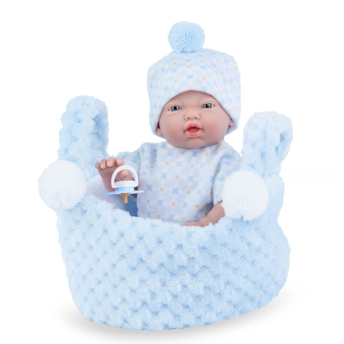 • Included: Vinyl doll, textured fabric basket, matching pom-pom hat, and blue pacifier.