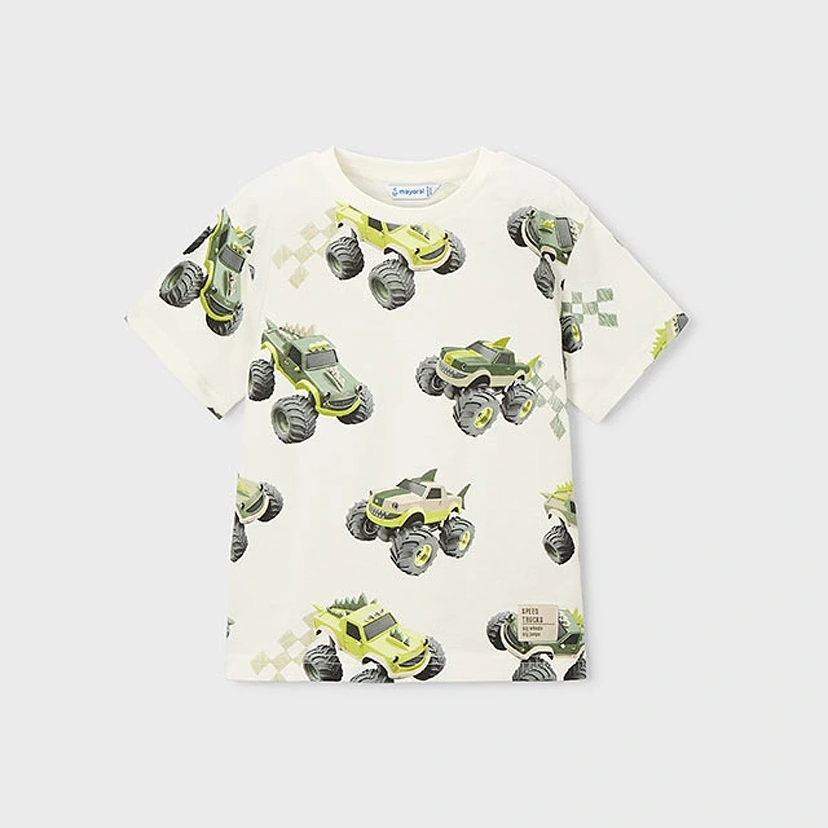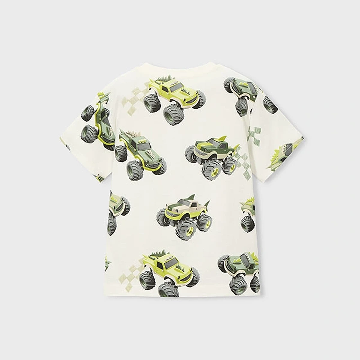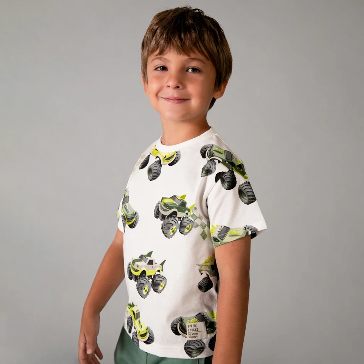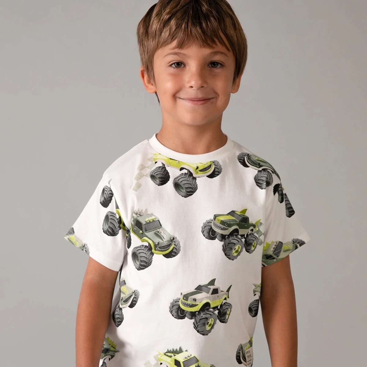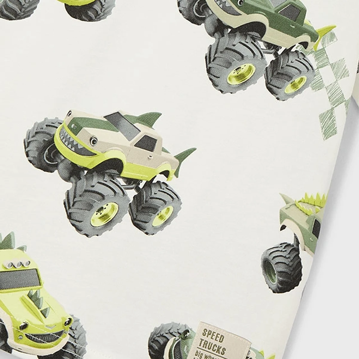 Rev up his wardrobe with this high-octane essential! This Mayoral tee is designed for the little guy who dreams of big wheels and epic stunts. Featuring a playful mash-up of monster trucks and prehistoric predators, it’s the perfect gear for a day of high-speed play.