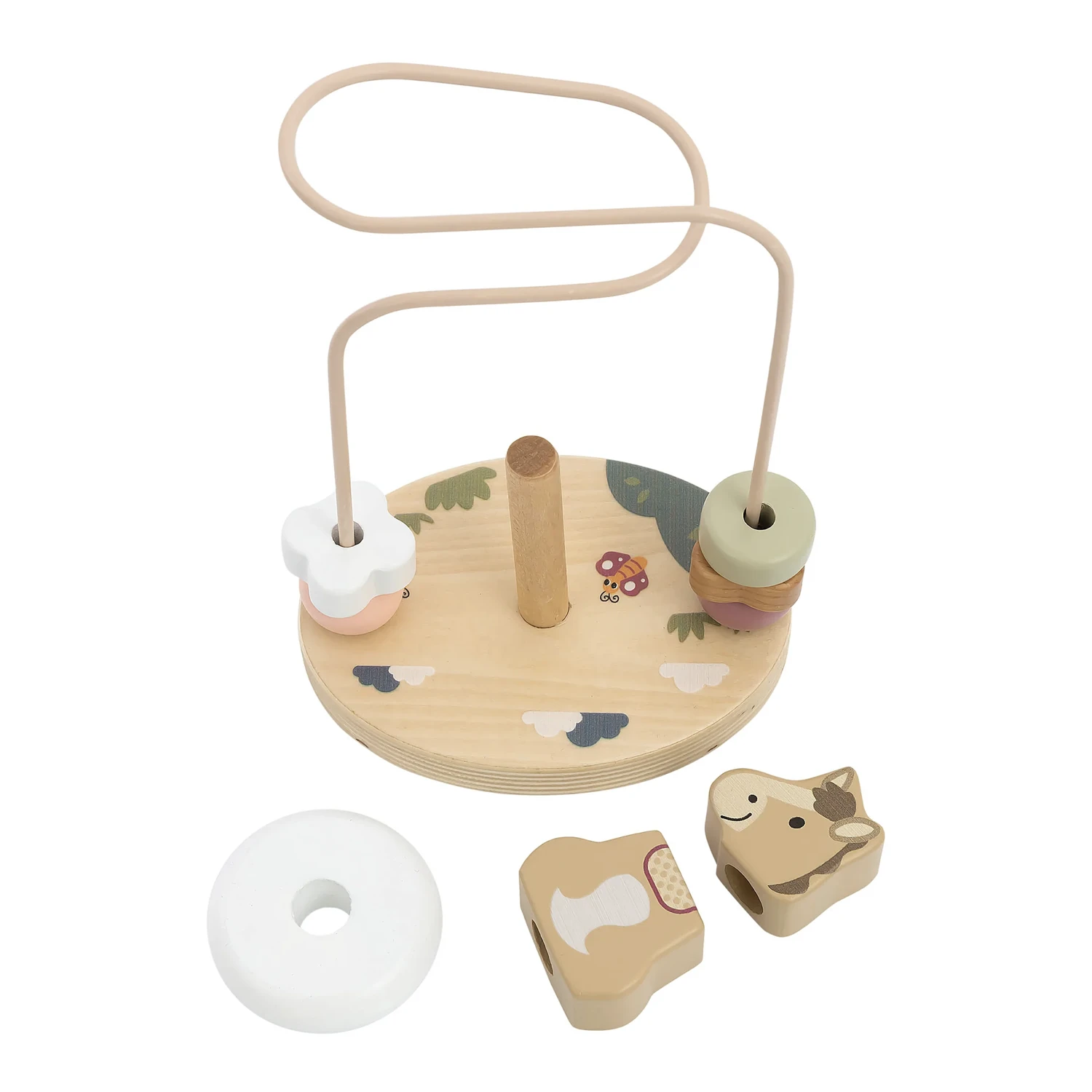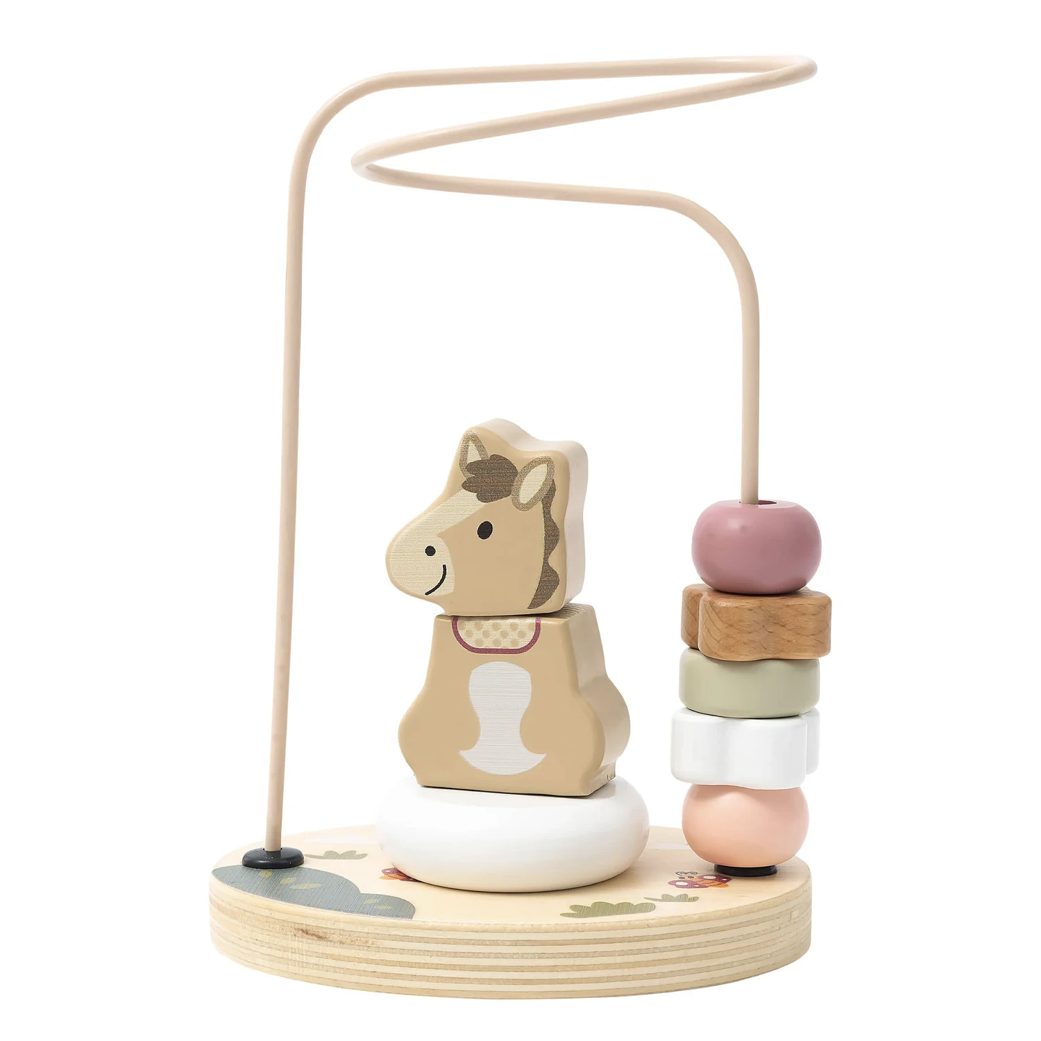 Stackable Sunny: Unlike a standard bead maze, this set features a central horse character, Sunny, made of three stackable wooden parts that can be taken apart and rebuilt on the central peg.