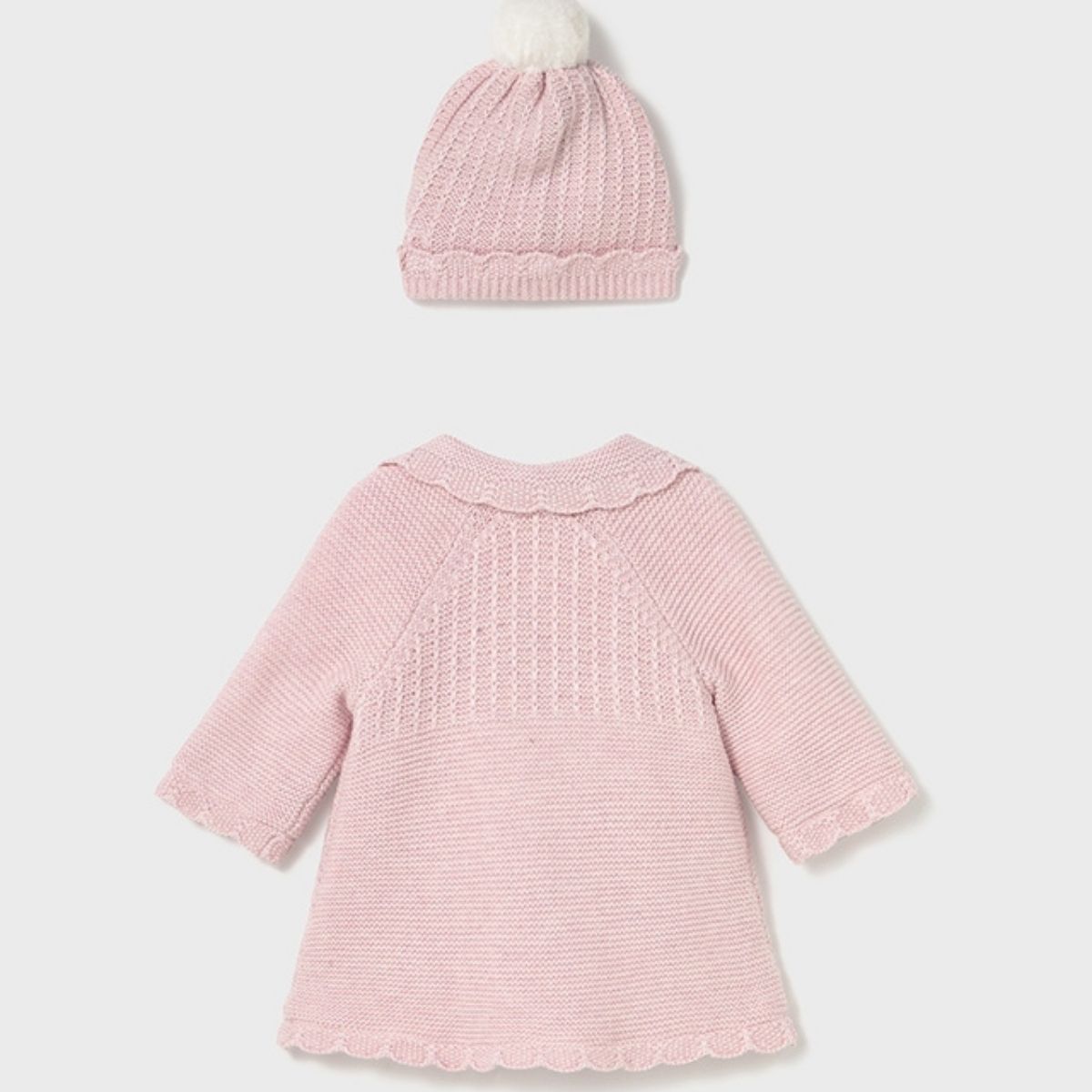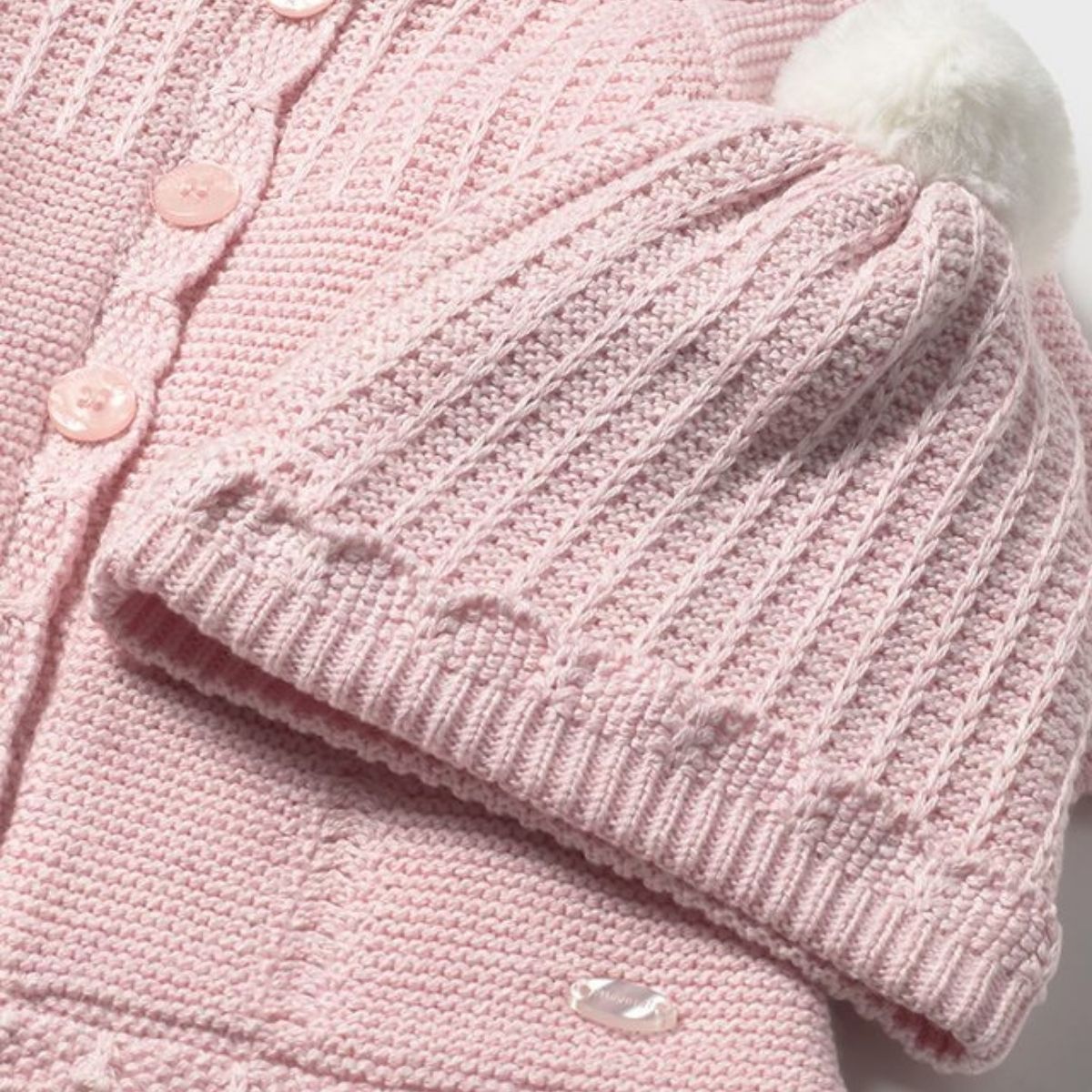 This charming two-piece set includes a beautifully knitted coat and matching hat in a delicate rose pink — the perfect layering duo for your little one’s first chilly days.