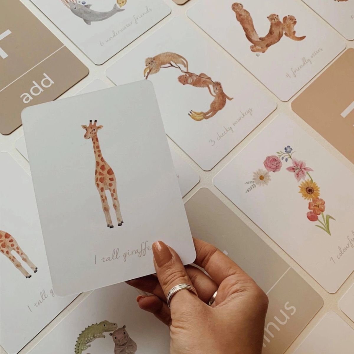 Make learning numbers a joy with these beautifully illustrated, double-sided flashcards. Designed to help little ones feel confident with counting, this set combines education with the charm of hand-painted animal artwork.