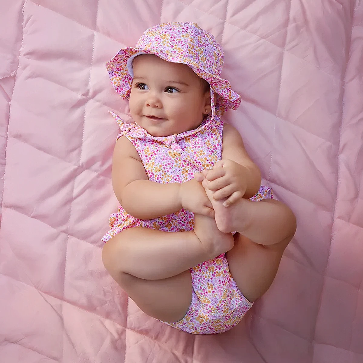 • Matching sun hat featuring a wide ruffled brim and a secure chin strap