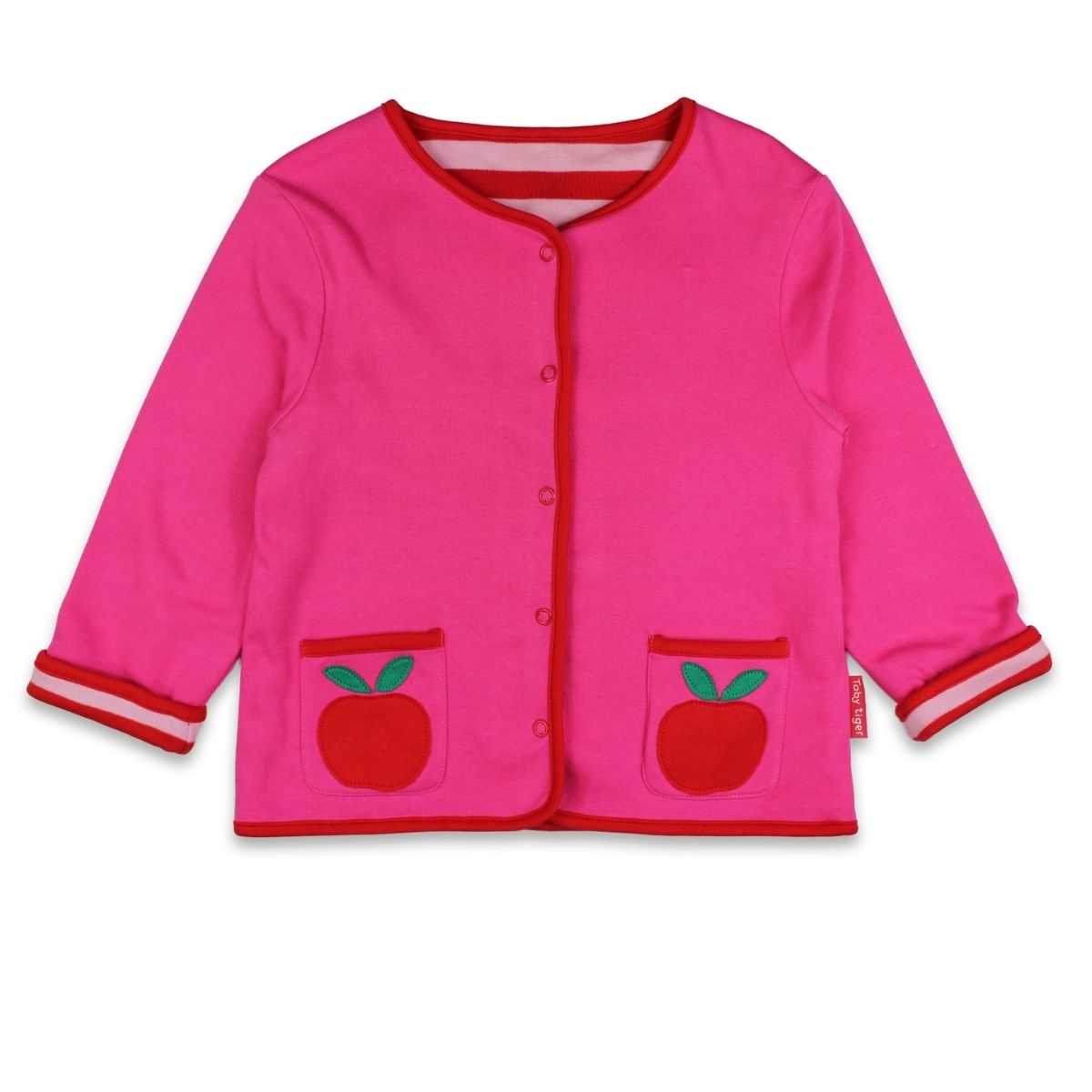 Made from super-soft GOTS-certified organic cotton, it’s gentle on little ones’ skin and kind to the planet. The front features adorable apple appliqués on handy pockets, while the reverse side reveals bright pink and red stripes — two cheerful looks in one cosy jacket!