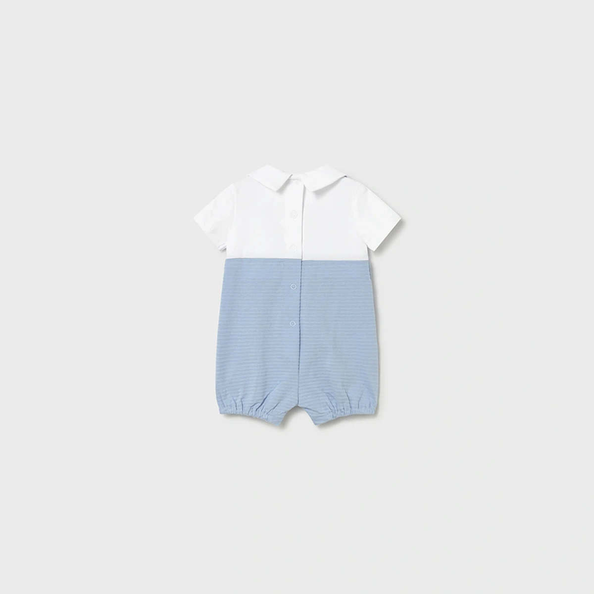 Design: Short-sleeved romper with an integrated (or mock) white shirt and Peter Pan collar.