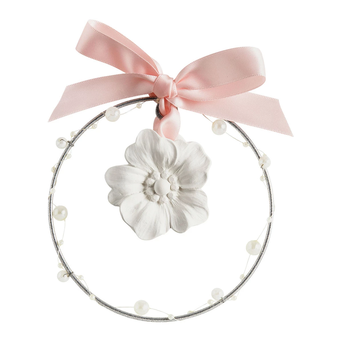 Part of the Pearly Party Collection, inspired by Queen Marie-Antoinette’s love for pearls and luminous beauty, this wreath is adorned with a scented plaster flower suspended from a silver ring decorated with pearly beads and a soft pink ribbon. Perfect as a charming decoration for a nursery, living room, or festive table, it adds a gentle glow and fragrance to every corner of your home.