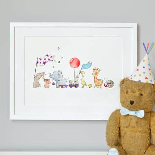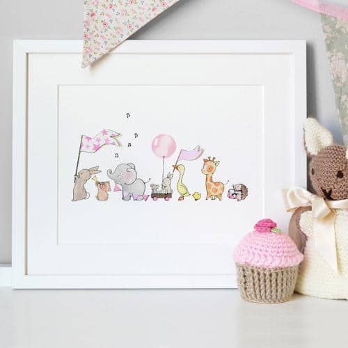 Fine Art Giclée print, printed with pigment inks on high quality acid-free archival paper. Framing – textured matt white wood frames are made by a professional British framers, with professional corners and finish. Your print will arrive in the frame, with the back sealed and picture cord attached ready for hanging. Little paper flags and paper balloon are attached by hand to add a final special touch to this print!