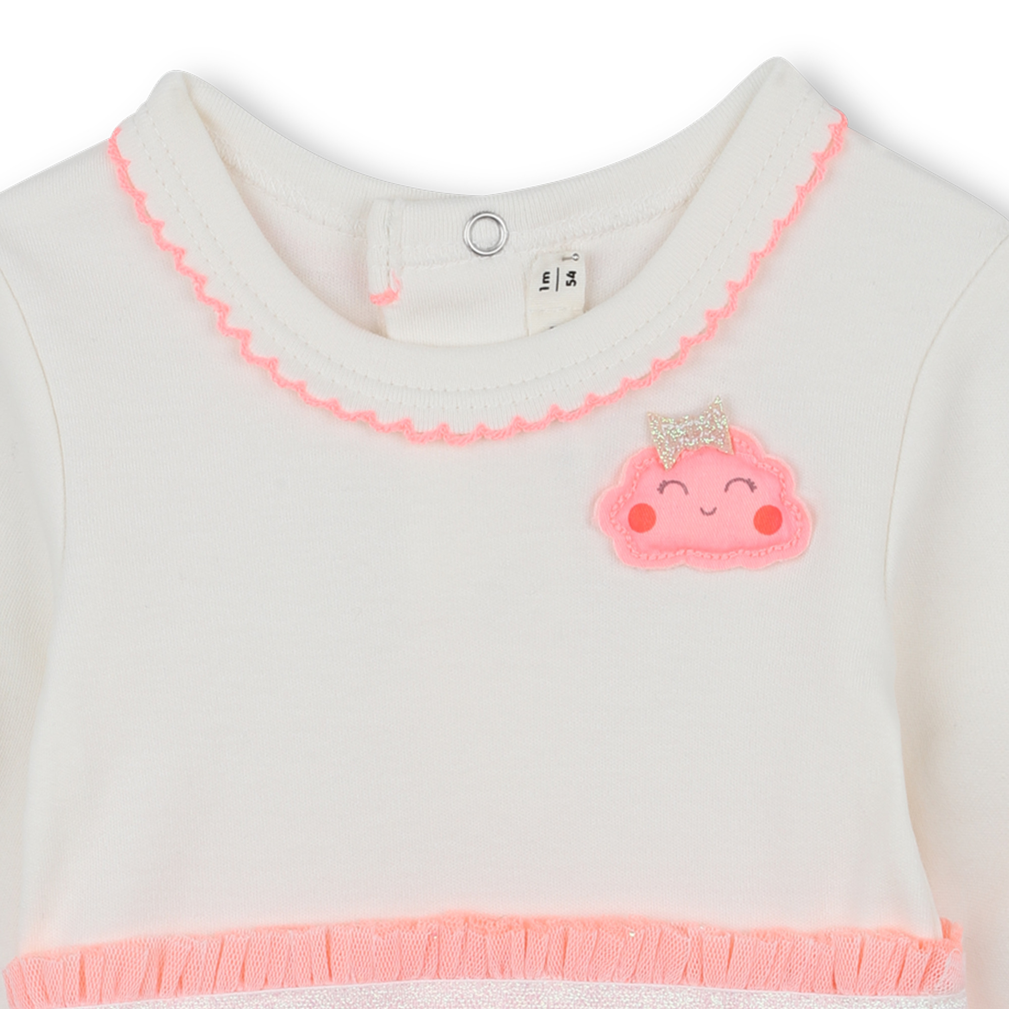 The top features long sleeves and a cute 3D cloud badge with a glittery gold crown, adding a playful and magical Billieblush touch. The waist is defined by a sparkly elastic band, flowing into a voluminous glittery pink tulle skirt that shimmers beautifully with every little movement. Designed for practicality as well as style, it includes press-stud fastenings at the back and between the legs for easy dressing and changing.